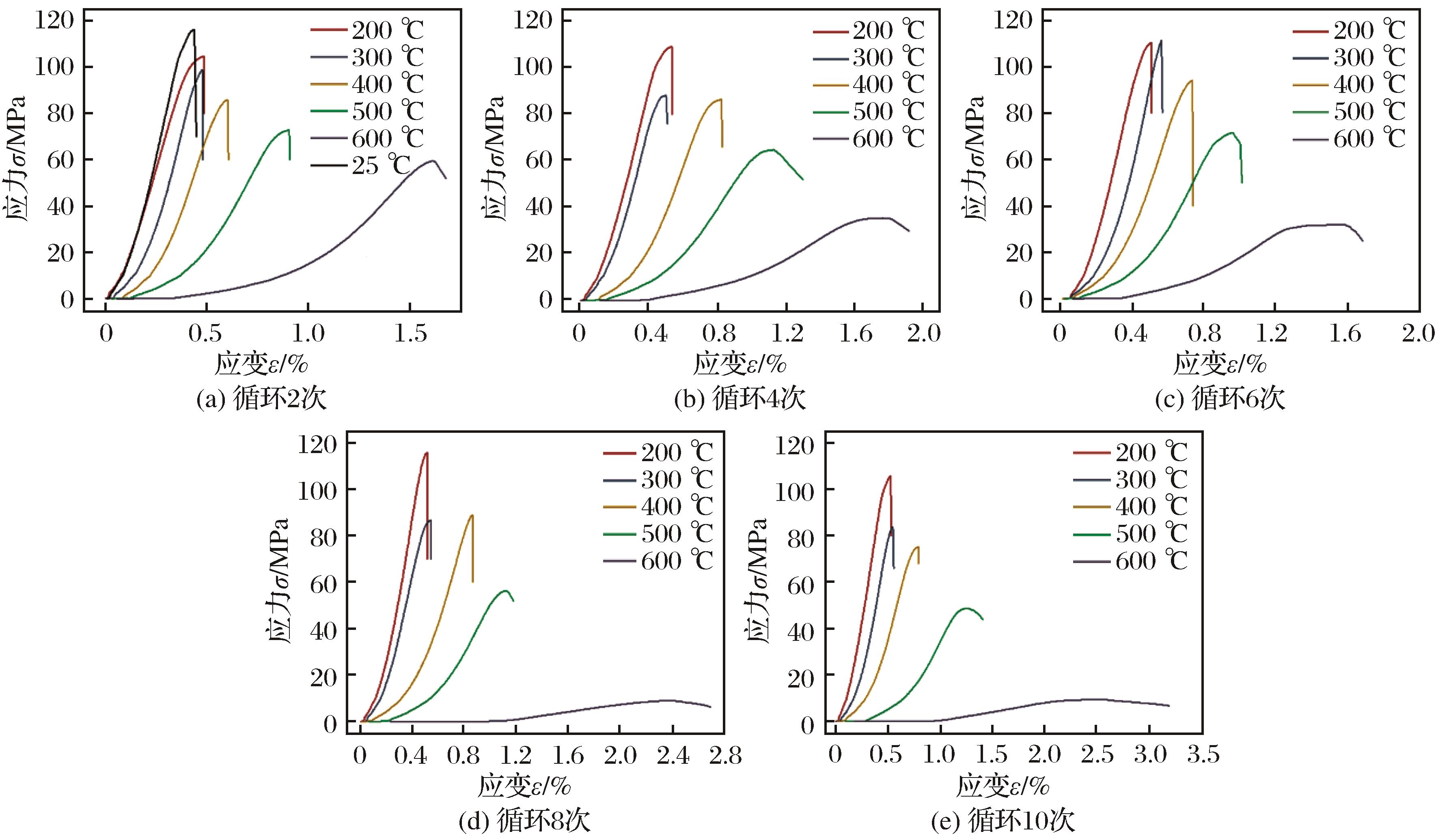 | 图5 不同温度及循环次数条件下花岗岩试件单轴应力—应变曲线 |