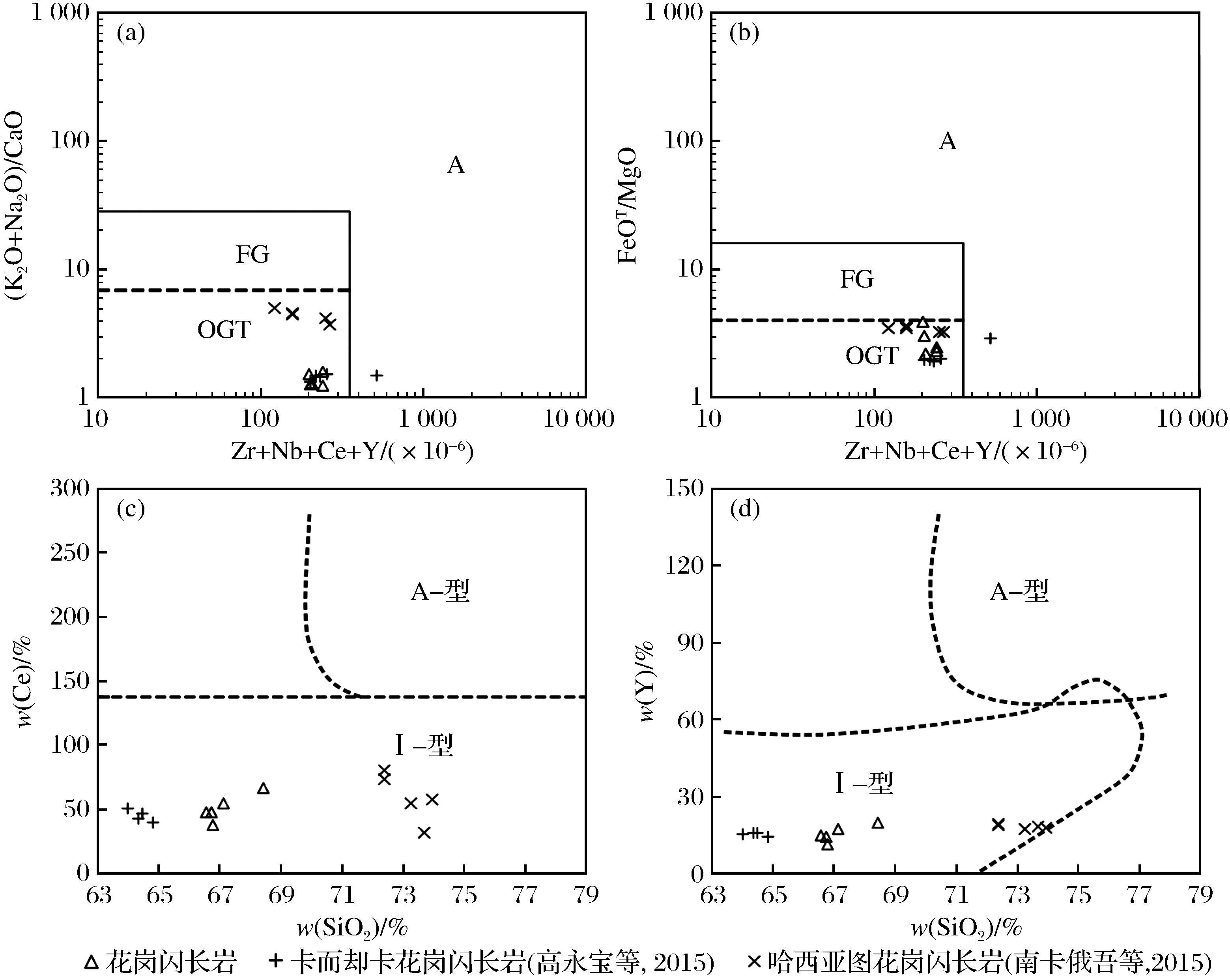 | 图7 库德尔特金矿床花岗闪长岩Zr+Nb+Ce+Y-(K2O+Na2O)/CaO(a)、Zr+Nb+Ce+Y-FeOt/MgO(b)、SiO2-Ce(c)和SiO2-Nb(d)图解(底图据 A-A型花岗岩;FG-分异长英质花岗岩;OGT-未分异的I型和S型花岗岩 |