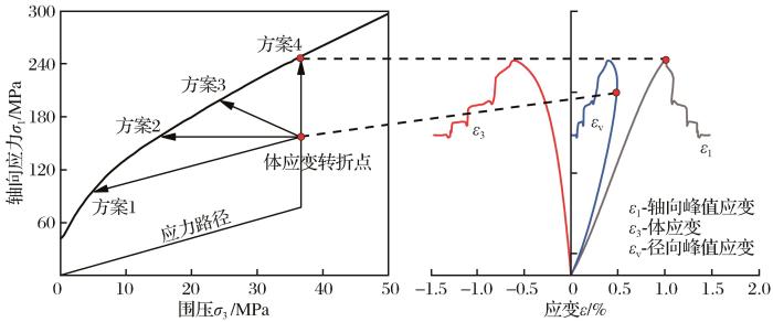 在岩石加卸载试验中,由于体应变转折时岩石内部损伤加快,岩石会从稳定状态向不稳定状态过渡,应力—应变曲线从线弹性阶段向塑性阶段过渡,裂纹开始扩展。此种状态在工程中容易引发灾害,故将应力—应变状态的体应变转折点视为卸荷点,认为该点为岩石状态的脆延性转折点。根据已有成果及数值模拟结果,提出了描述巷道开挖过程应力状态的4种应力路径,即围压卸载—轴压减少(方案1)、围压卸载—轴压不变(方案2)、围压卸载—轴压增加(方案3)和围压不变—轴压增加(方案4),如图2所示。