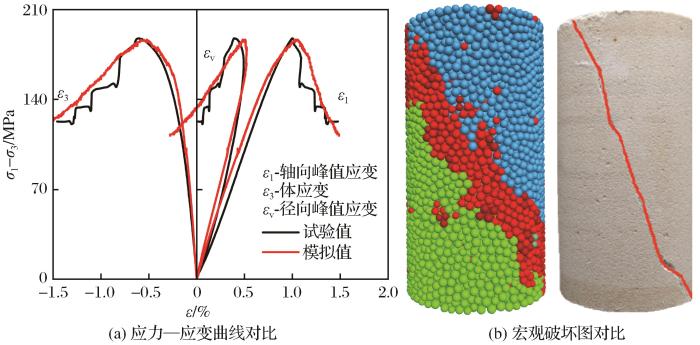 由图5可以看出,离散元试样与室内岩石力学试验所得到的应力—应变曲线、宏观破坏模式基本一致,说明离散元试样在加载过程中能够很好地还原室内试验结果,可用于开展不同卸载路径下的岩石三轴压缩试验。