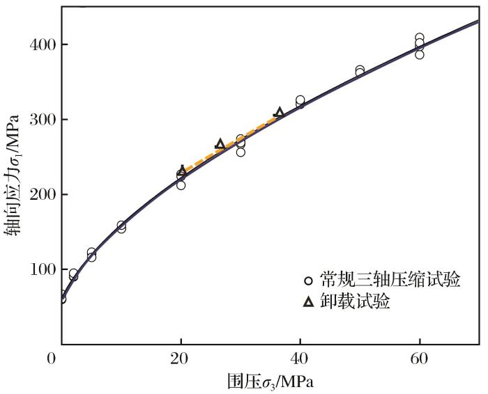 根据常规三轴压缩试验结果,结合图2中提出的卸载方案,发现体应变转折点大约出现在峰前80%峰值强度处,因此对试样在峰前80%峰值强度处进行不同应力卸载路径试验。应力卸载路径试验通过伺服加卸载试验系统完成,具体是利用Fish语言控制颗粒的附加力来实现。对不同卸载路径下得到的强度数据进行统计(图8),可以发现不同卸载路径下同一种岩石的破坏过程也遵循Hoek-Brown强度准则,即不同的应力路径不会影响岩石的最终强度,这与前人文献(Swansson et al.,1971;Crouch,1972;陈旦熹等,1982;吴玉山等,1984)得出的结论一致。
