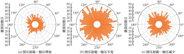 图14为不同应力路径下岩样的微裂纹统计情况。从裂纹数量来看,围压卸载—轴压不变过程中岩样的裂纹总量最多。分析其原因,在围压卸载—轴压增加和围压卸载—轴压减少2种应力状态下岩样的应力集中程度更高,在不稳定的裂纹扩展过程中容易导致岩样宏观破坏的产生,而围压卸载—轴压不变应力状态下岩样的应力集中程度低,应力状态更加稳定,裂纹发育过程缓慢,从而在宏观破坏前产生了更多的微观裂纹数量。从裂纹倾角分布来看,裂纹的方向主要集中在45°和135°方向,这与内摩擦角和应力状态有关,裂纹倾角分布受到应力路径的影响较小。