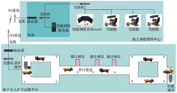 当前信息传输系统组成按其所处位置可划分为地下和地表设备。地表设备包括核心交换机和智能调度系统服务器,地下设备包括通信基站、网络交换机、路由器和5G车载CPE等。通信基站通过无线传输与车载终端进行车地通信,从而实现调度中心与移动设备之间的数据传输。井下网络交换机以光纤作为传输介质,相互连接组成井下环形工业以太网,地面环网和井下环网通过控制中心机房的工业级核心交换机相连接,构成统一的矿井通信网络。无线通信基站安装在巷道的两侧,通过光纤接入井下环网。井下环网通过对多功能网关进行设置,与无线通信基站共同构成无线网络,实现井下巷道网络全覆盖(陈相蒙等,2020)。