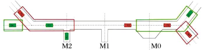 M0,M1,M2为双向通行巷道中的3个会车硐室,En表示空车(未装矿),Fm表示重车(已装矿),2种生产状态的车辆相对行驶。其中绿色与红色的实线框表示车辆检测区域电子围栏,对应空车重车驶入驶离电子围栏。当车队进入检测电子围栏内时,调度系统依据当前场景中车辆的对应位置信息下发相关决策指令。如图4所示,F1所在的红框区域为重车驶离电子围栏,E4所在的绿框区域为空车驶入电子围栏,E1所在的绿框区域为空车驶离电子围栏,F4所在的红框区域为重车驶入电子围栏。当重车驶离电子围栏内存在重车时,在空车驶入电子围栏内的空车必须停车等待;当空车驶离电子围栏内存在空车时,在重车驶入电子围栏内的重车必须停车等待。