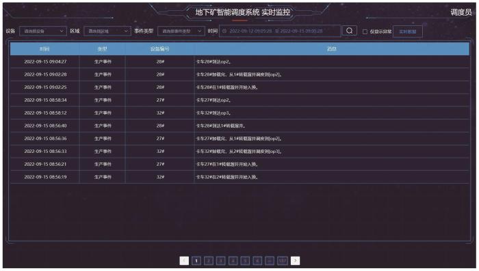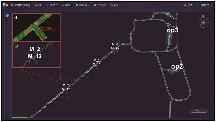 无人矿卡智能调度系统通过Web界面进行访问,实现人机可交互式操作模式。调度系统包含6个功能模块:实时监控、调度台、调度可视化、生产管理、设备检测和参数配置。其中,车辆定位、转运道及各生产区域相对位置信息均显示于调度可视化界面(图5),操作人员可直观地监测到转运道内各设备生产情况及各车辆相对位置。图5(a)为M2硐室后台绘制界面中的结构示意图,两侧黄色多段线闭合图形即为电子围栏,绿色区域为硐室结构示意图,调度系统依据后台绘制地图中各类特征电子围栏区域信息执行调度决策;图5(b)为M2硐室Web界面结构示意图,为避免前端界面展示的多类元素重叠杂乱,仅展示出硐室与道路结构。调度台与生产管理相结合(图6),可发布阶段性工区生产任务及各装载溜井当前料位信息,实现无人矿卡自动派车调度。实时监控界面(图7)可获取实时生产信息,包括装卸和运输等生产信息,设备状态等设备信息。设备检测功能可实现车辆轨迹回放,设备故障、超速和点检等统计报表。参数配置功能主要用于系统部署前期,依据现场实际情况进行相应参数调整,以便系统能够更好地适配场景进行运行。