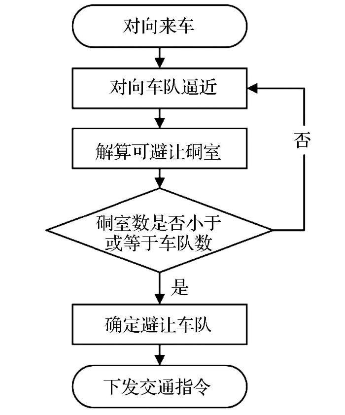 当避让车队错车驶离硐室后,若下一避让硐室或岔道出口及其外侧避让区域没有对向车队,则下发正常通行指令;若存在对向车队,则重复会车决策流程(图8),进行二次会车。待避让车队驶离硐室,硐室内泊车车队恢复执行正常通行指令。