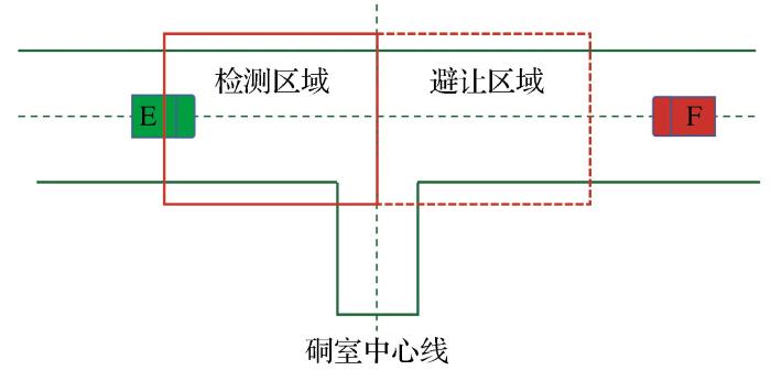 如图9所示,硐室两侧区域留有安全行驶缓冲区。对于避让的重车,设置一段避让指令响应的最短距离,形成避让区域电子围栏;对于通行的空车,设置一段最短停车等待的检测区域电子围栏,当避让车辆尚未进入硐室完成泊车前,通行车辆必须在停车等待的检测区域内停车,且不能越过避让硐室。其中,避让电子围栏和检测电子围栏以硐室中心线为边界。