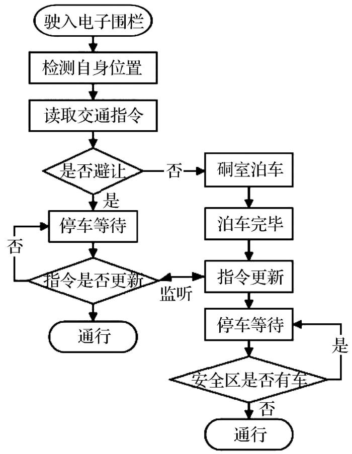 避让—泊车执行流程如图10所示,车辆驶入电子围栏后,通过检测自身位置和电子围栏信息,读取调度系统下发的交通指令,判断是否为避让车队。若为避让车队,执行停车等待操作;若为非避让车队,则执行硐室泊车操作,待泊车完毕后交通指令更新并停车等待。此时避让车队监听到指令更新事件,获取通行指令。若泊车车队监测硐室两侧的安全行驶缓冲区内没有其他车辆,则执行出硐通行指令,否则继续停车等待。