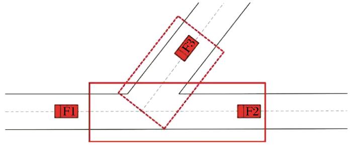分支巷道装载完成车队并入主干巷道,如图11所示,当车辆(F3)驶入支道会车电子围栏(红色虚线框)内,即越过会车电子围栏与车道边界线后,若检测到主干会车电子围栏(红色实线框)内不存在其他车辆,则执行正常通行指令;若检测到主干会车电子围栏内已存在正常通行车辆,则执行等待避让指令,待主干会车电子围栏内车辆驶离后,恢复正常通行指令。当车辆(F2)驶入主干会车电子围栏内后,若检测到支道会车电子围栏内不存在其他车辆,则执行正常通行指令;若检测到已存在正常通行车辆,则执行等待避让指令,待支道会车电子围栏内车辆并入主干道后,恢复正常通行指令。