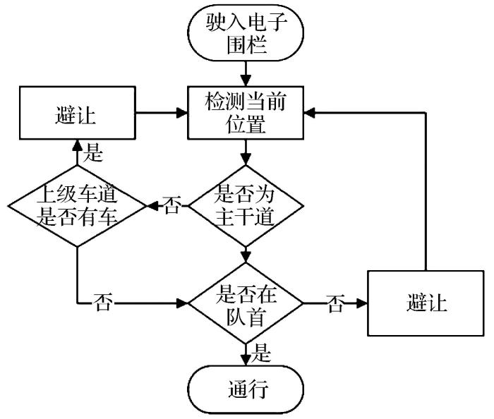 多车道会入主车道决策流程如图12所示,当车辆驶入电子围栏后,调度系统通过检测当前车辆位置和所处电子围栏信息,获取车辆所处车道类型优先级和该车道队列位置。