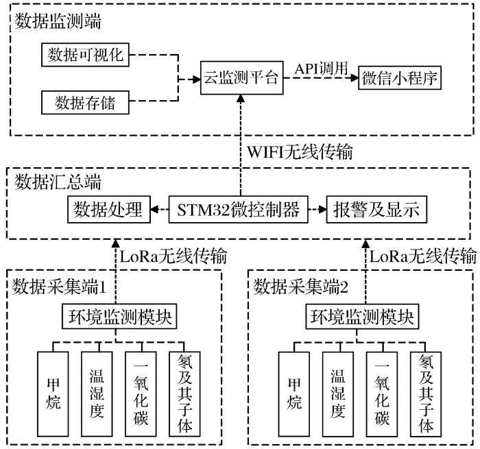 系统总体结构包括数据采集端、数据汇总端和数据监测端3个部分。环境数据采集端所有外围模块连接至STM32,使用Keil5编写各模块驱动程序,烧录至STM32驱动各模块运行,随后通过LoRa模块将采集的数据发送至中继节点,中继节点以“中继模式”,即按照设定的路径将接收到的数据转发,直至汇总端,以达到延长传输距离的目的。数据汇总端通过LoRa模块接收监测节点发送的数据,经过打包处理后由WIFI模块上传至云平台。在云平台对数据流进行解析,通过数据监测页面设计展示数据图形并完成对应监测数据绑定,最终实现云平台监测数据的可视化,移动端在微信小程序界面设计后调用云平台相关API获得所需监测数据。系统总体结构如图1所示。