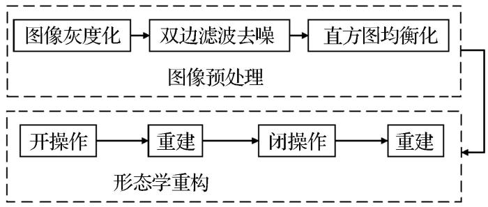 分水岭(WA)算法是一种基于地理形态学理论的分割方法(Lin et al.,2021,2022)。利用WA算法进行分割图像能够得到连续、闭合的目标边界。对矿石图像运用WA算法分割,会产生过分割的现象,因此本文采用基于距离变换的WA算法进行图像边缘分割,能够得到更为精确的矿石图像分割结果。基于距离变换的WA算法流程为