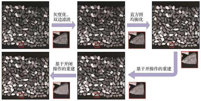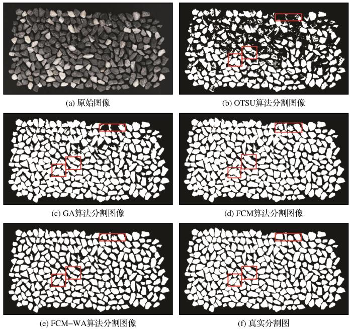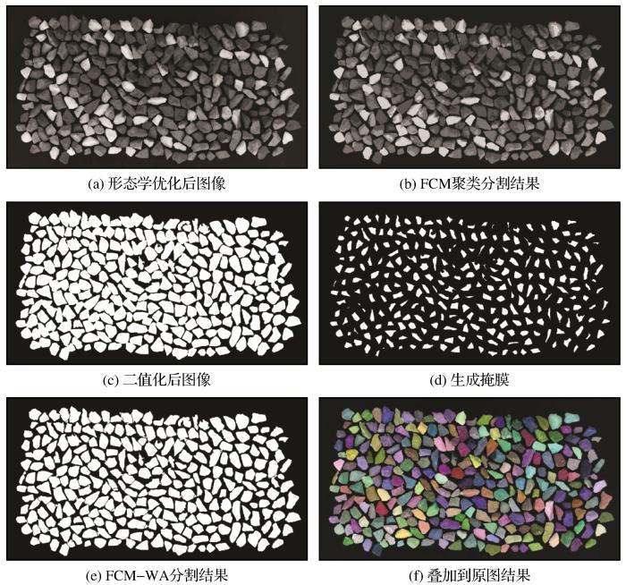 基于聚类的图像分割方法,由于能够将特征相近的像素划分到相同的类里,可以较好地解决多种类目标图像分割问题,适用于多种类矿石图像的分割。在聚类算法中,由于FCM聚类算法不受样本数据的维度限制,且具有良好的稳健性,因此基于FCM聚类算法的图像分割得到了广泛关注。Huang et al.(2019)利用FCM算法对脑CT图像进行了分割,取得了较好的结果。Qin et al.(2019)提出了一种基于FCM聚类的路面图像分割方法,成功实现了路面图像的分割。FCM算法虽然具有良好的稳健性,但易受到噪声干扰,出现过分割现象,且该算法无法对矿石粘连的边缘部分进行有效分割,从而导致矿石粒度准确率过低,而分水岭算法则常用于解决边缘粘连部分的分割。Zhou et al.(2022)和张建立等(2020)利用改进的分水岭算法对骨区影像进行分割,成功分割了图像中的粘连区域。