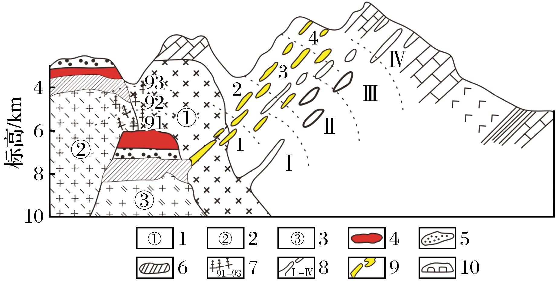 | 图3 与花岗岩有关的稀有金属矿床成矿模式图( 1.第一期花岗岩;2.第二期花岗岩;3.第三期花岗岩;4.强钠长石化花岗岩;5.中钠长石化花岗岩;6.弱钠长石化花岗岩;7.热液矿床及分布;8.与第一期花岗岩有关的侧向伟晶岩及其分带;9.与晚期花岗岩有关的侧向伟晶岩及其分带;10.顶盖伟晶岩 |
