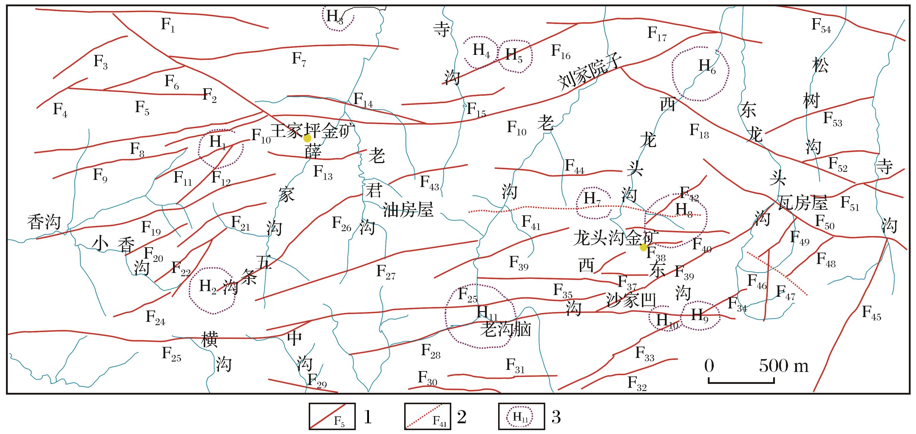 | 图10 龙头沟金矿及周边地区遥感构造解译图 1.遥感解译断裂及其编号;2.遥感解译推测断裂和隐伏断裂及其编号;3.遥感解译环形构造及编号 |
