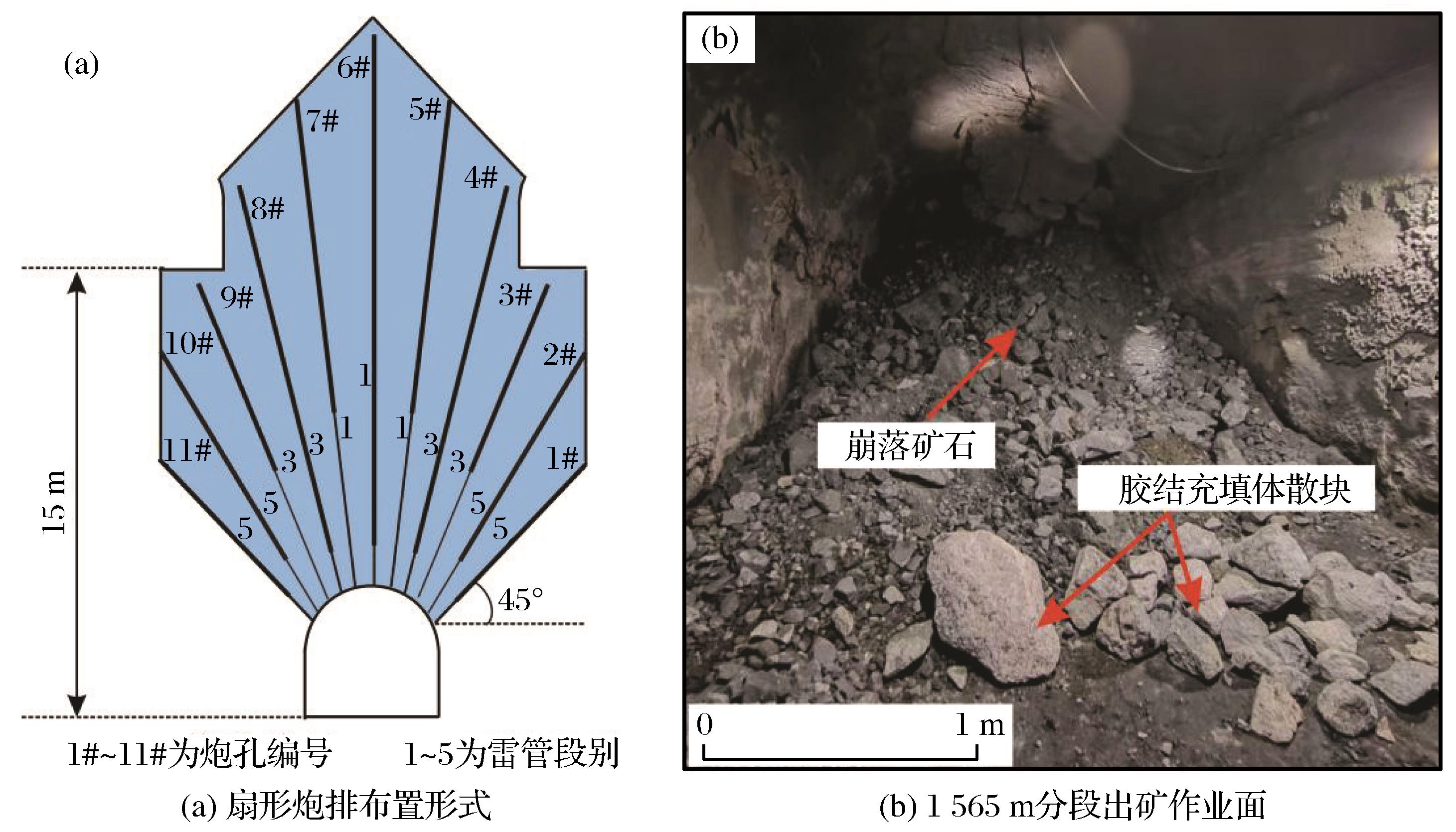 | Fig.10 Fan-shaped blasthole layout and blasting fragmentation effect |