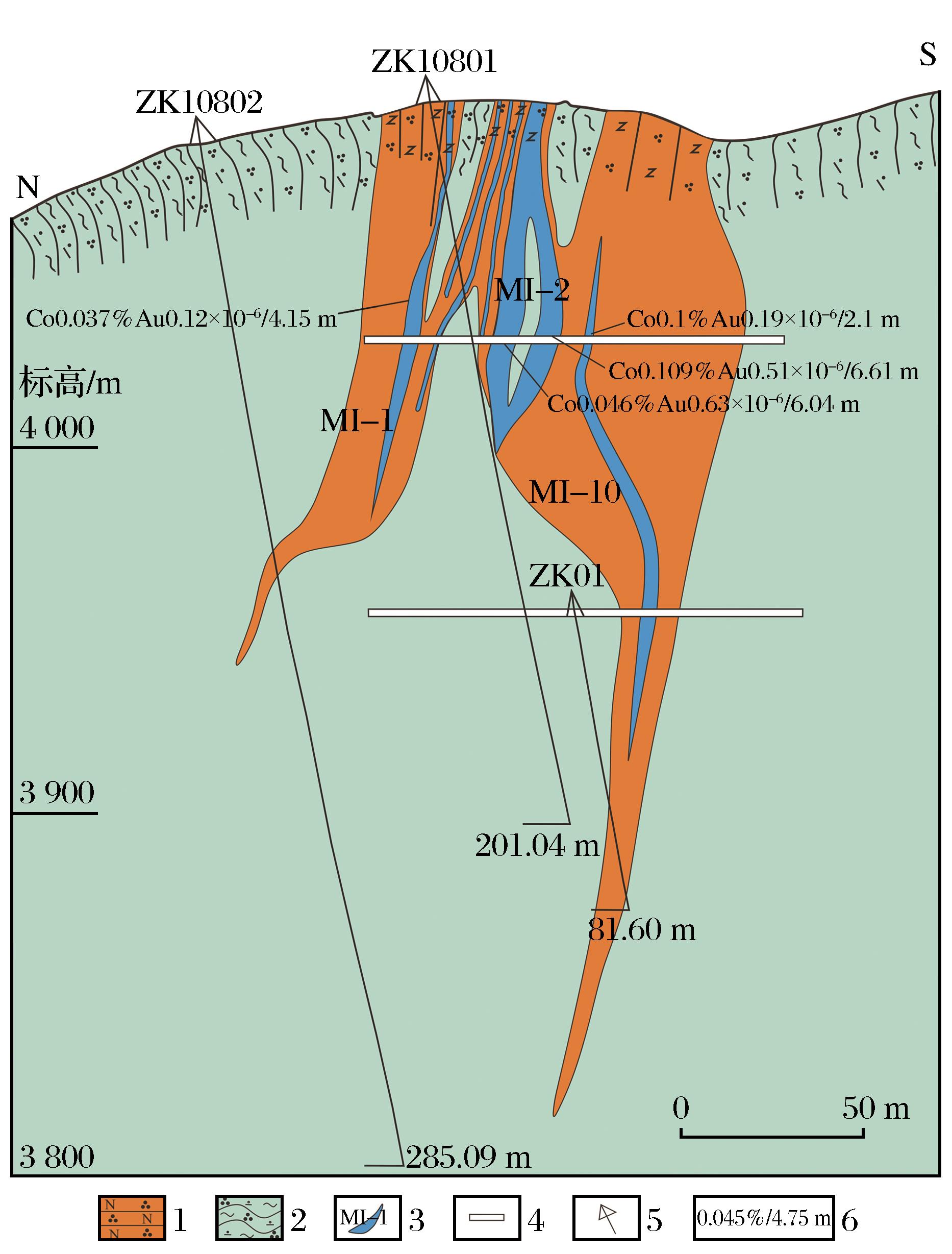 | 图3 驼路沟矿床108勘探线剖面图(修改自 1.石英钠长岩;2.绿泥石绢云母石英片岩;3.矿体及编号;4.平硐;5.钻孔;6.矿种(矿体)的平均品位/真厚度 |