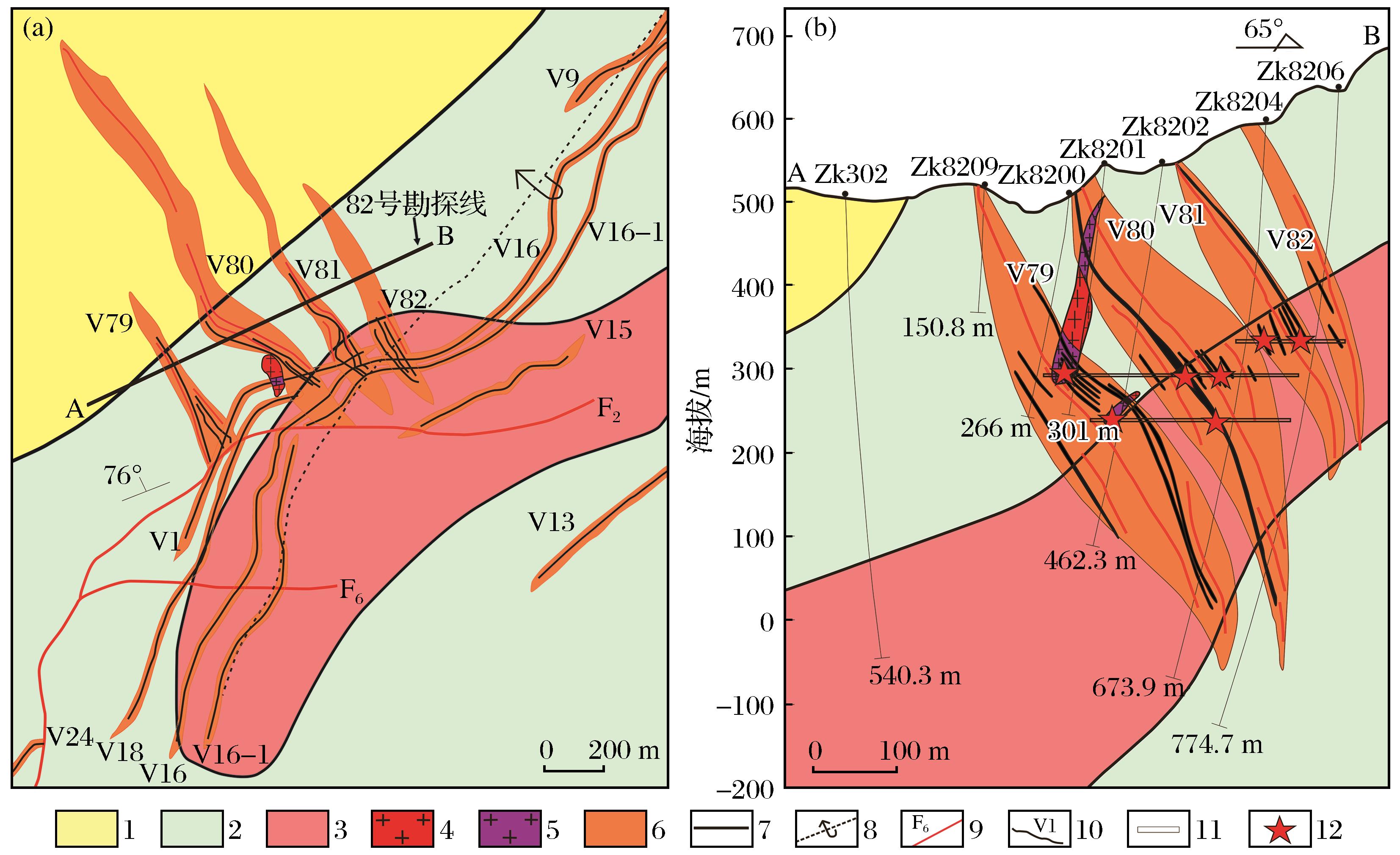 | 图2 正冲金矿床地质图(a)及82号钻孔勘探线(A-B)剖面图(b)(修改自 1.新元古界小木坪组;2.新元古界黄浒洞组上段;3.新元古界黄浒洞组下段;4.花岗岩;5.蚀变花岗岩;6.巷道;7.勘探线;8.倒转背斜;9.断层;10.蚀变带;11.矿体;12.样品位置 |