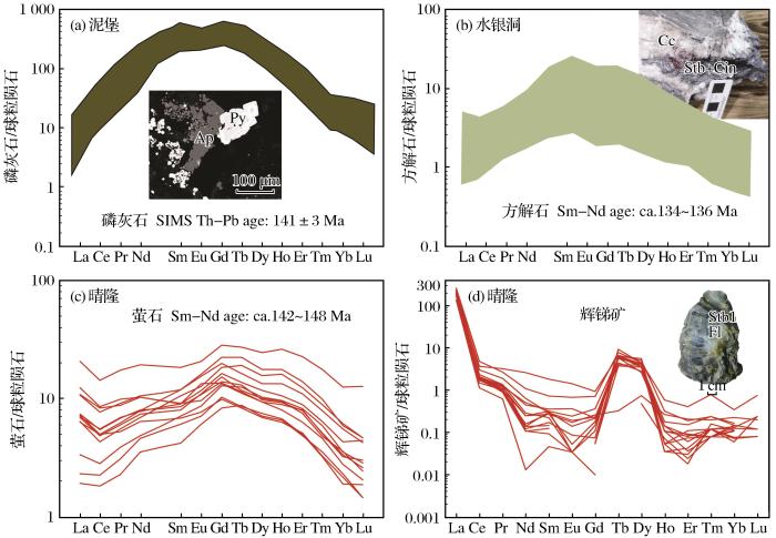 ... 注:辉锑矿流体包裹体发育,稀土元素也呈现出弱的MREE富集特征;泥堡稀土元素和成矿年龄数据引自Chen et al.(2019);水银洞稀土元素和成矿年龄数据引自Su et al.(2009);晴隆萤石年龄数据引自彭建堂等(2003)、稀土元素数据引自Chen et al.(2020);辉锑矿稀土元素数据来自本文 ...