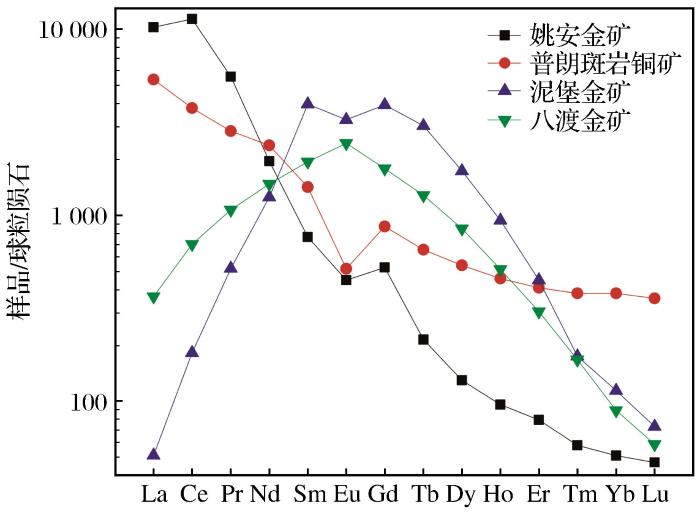Distribution patterns of rare earth elements(average value) related to gold mineralization in apatite from different gold deposits in Yunnan-Guizhou-Guangxi region