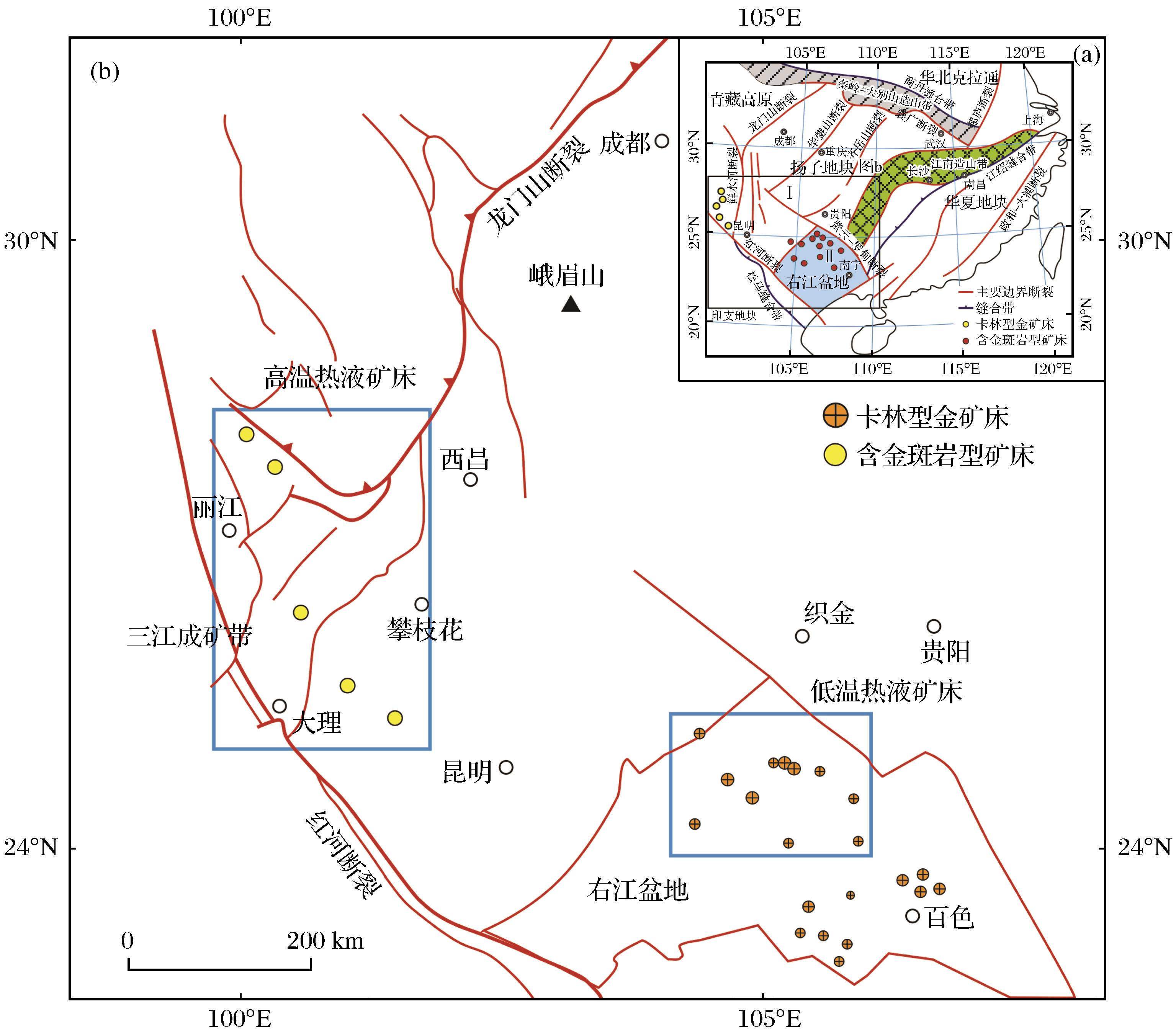 | 图1 滇—黔—桂地区高—低温热液金矿床位置分布和构造简图(修改自 (a)华南地区构造纲要图;(b)滇—黔—桂地区主要金矿床分布图 |