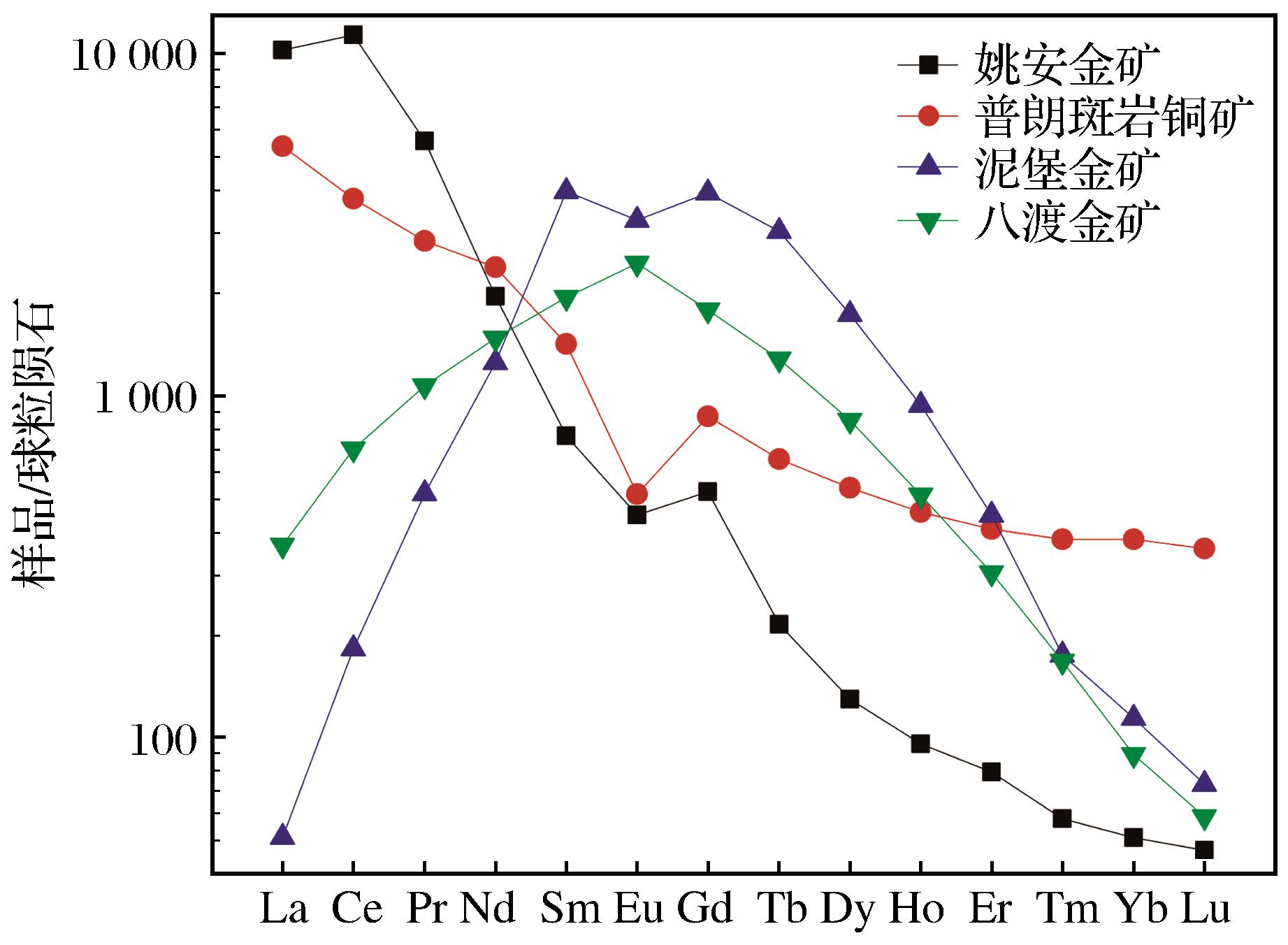 | Fig.5 Distribution patterns of rare earth elements(average value) related to gold mineralization in apatite from different gold deposits in Yunnan-Guizhou-Guangxi region |
