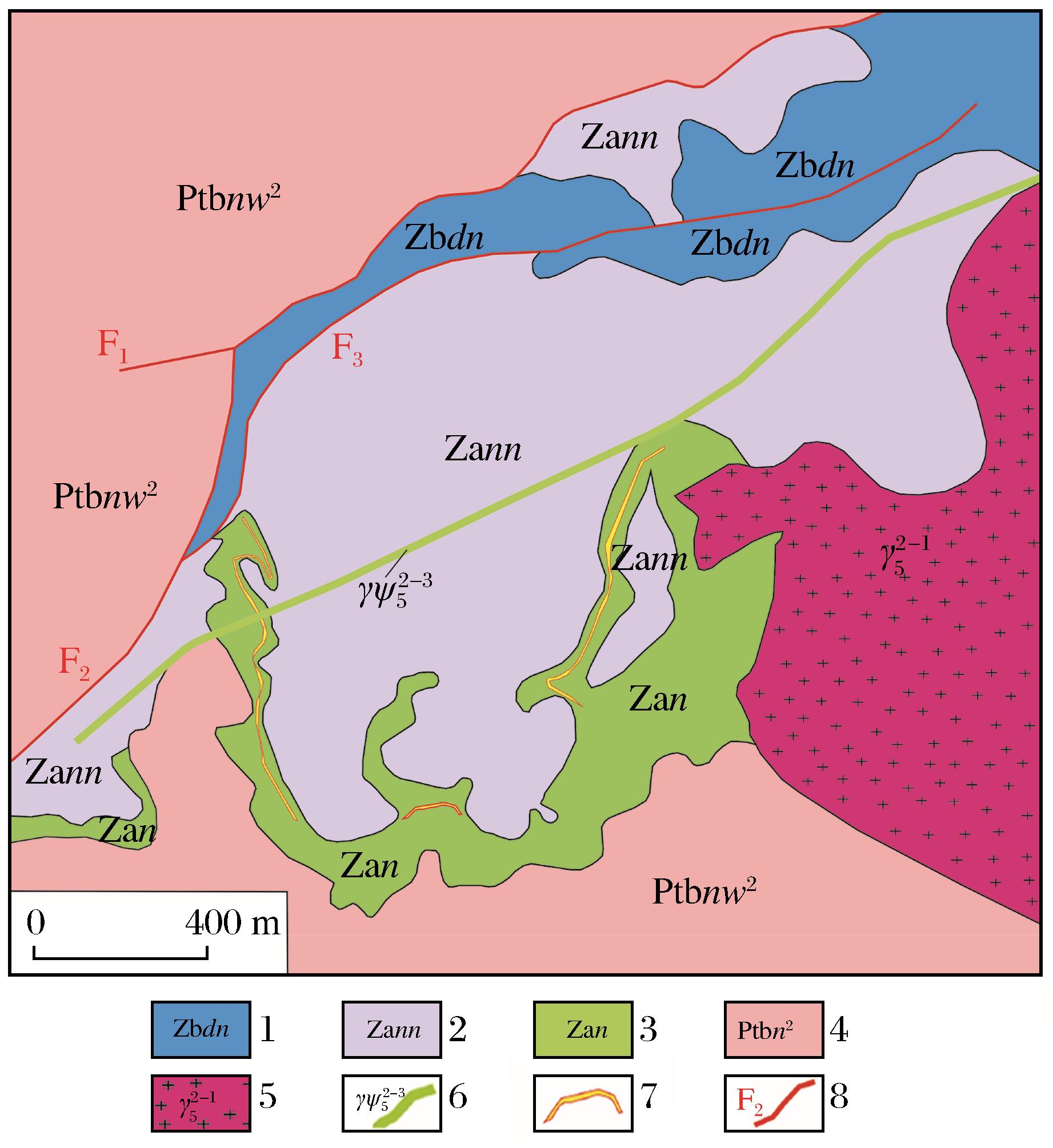 | 图2 大溶溪白钨矿床地质图 1.灯影组硅质岩;2.南沱冰碛岩组冰碛砾泥岩;3.南沱砂岩组砂岩;4.五强溪组板岩;5.大神山花岗岩;6.霏细斑岩脉;7.Ⅰ矿层(体)地表露头;8.断层及编号 |