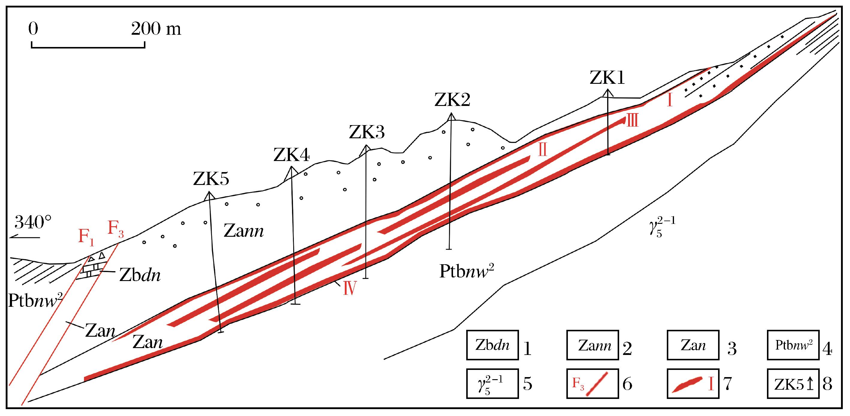 | 图3 大溶溪白钨矿区第三勘探线地质剖面图(修改自 1.灯影组硅质岩;2.南沱冰碛岩组冰碛砾泥岩;3.南沱砂岩组砂岩;4.五强溪组板岩;5.大神山花岗岩;6.断层及编号;7.矿层(体)及编号;8.钻孔及编号 |