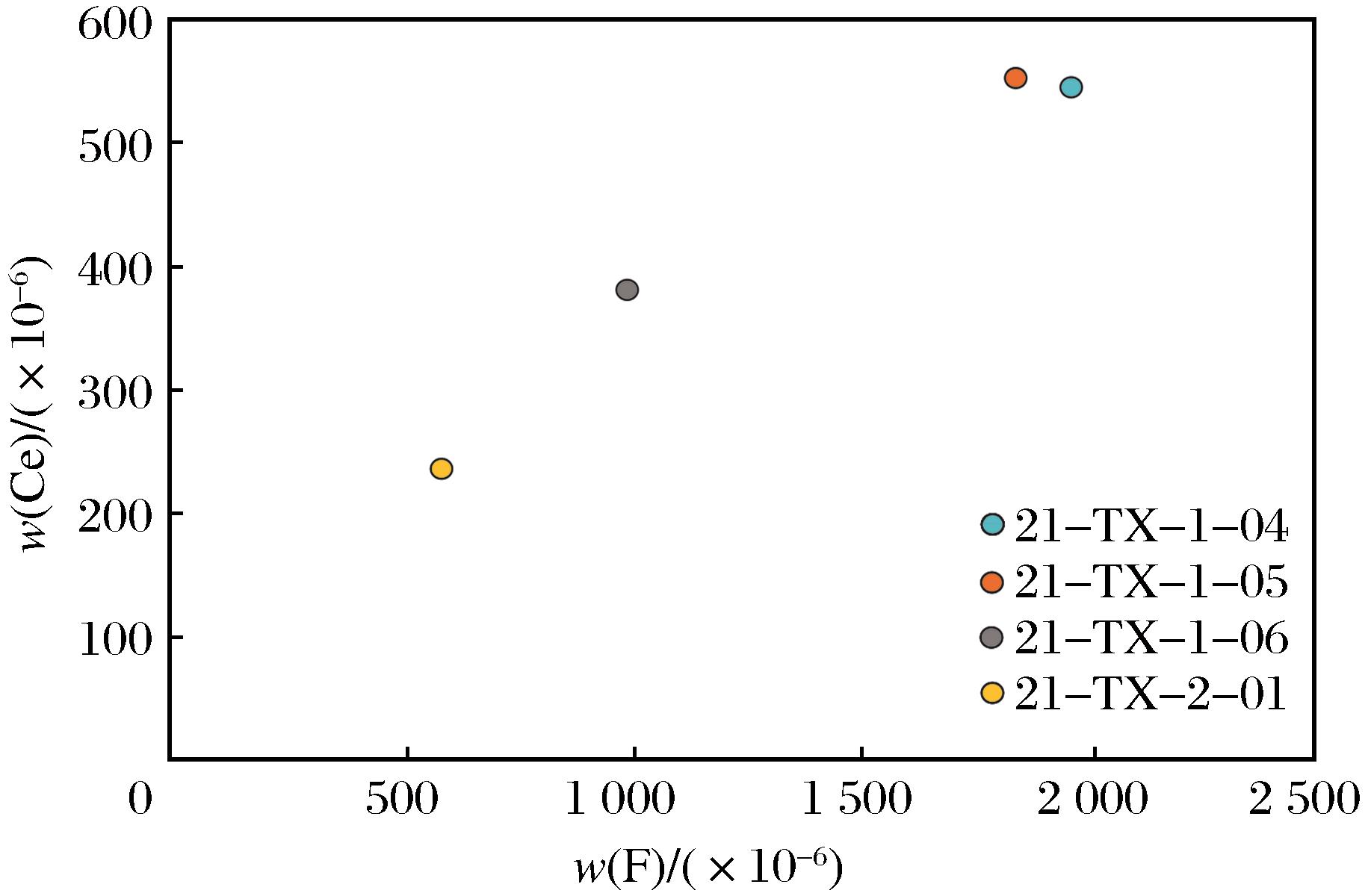 | Fig.4 Correlation diagram between light rare earth mineralization( Ce ) and F in Kuzigan alkaline complex |