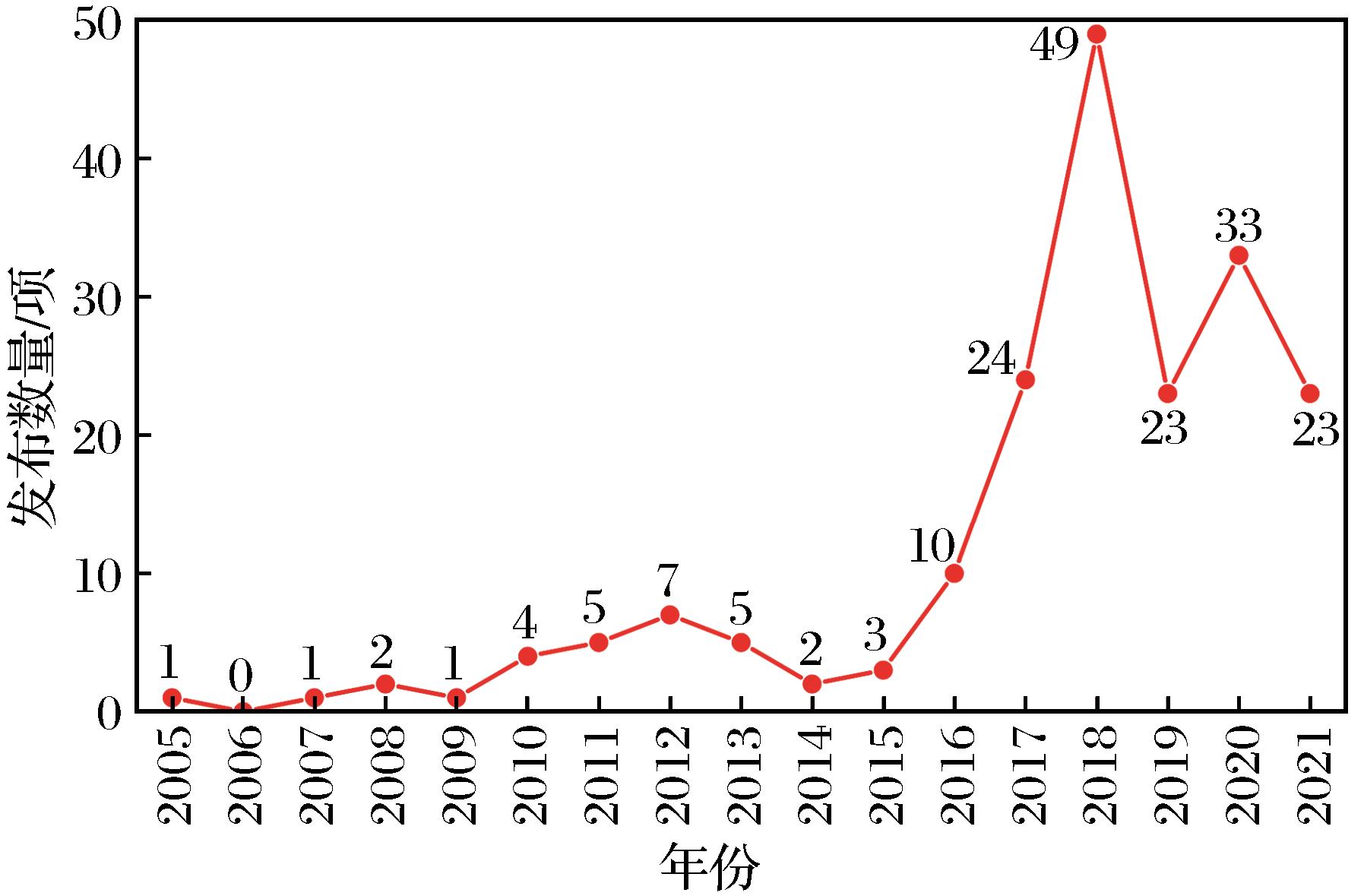 | Fig.2 Statistics of the release number of China’s green mine construction policy from 2005 to 2021 |