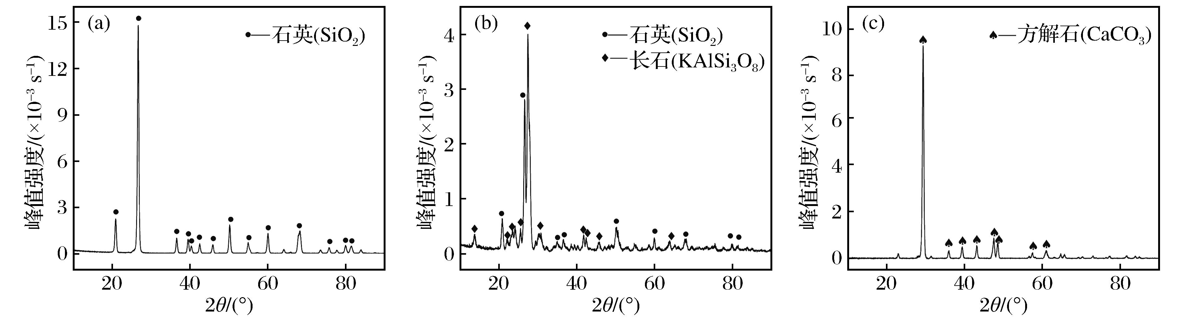 | 图1 典型脉石矿物样品的X射线衍射图谱 (a)石英;(b)长石;(c)方解石 |
