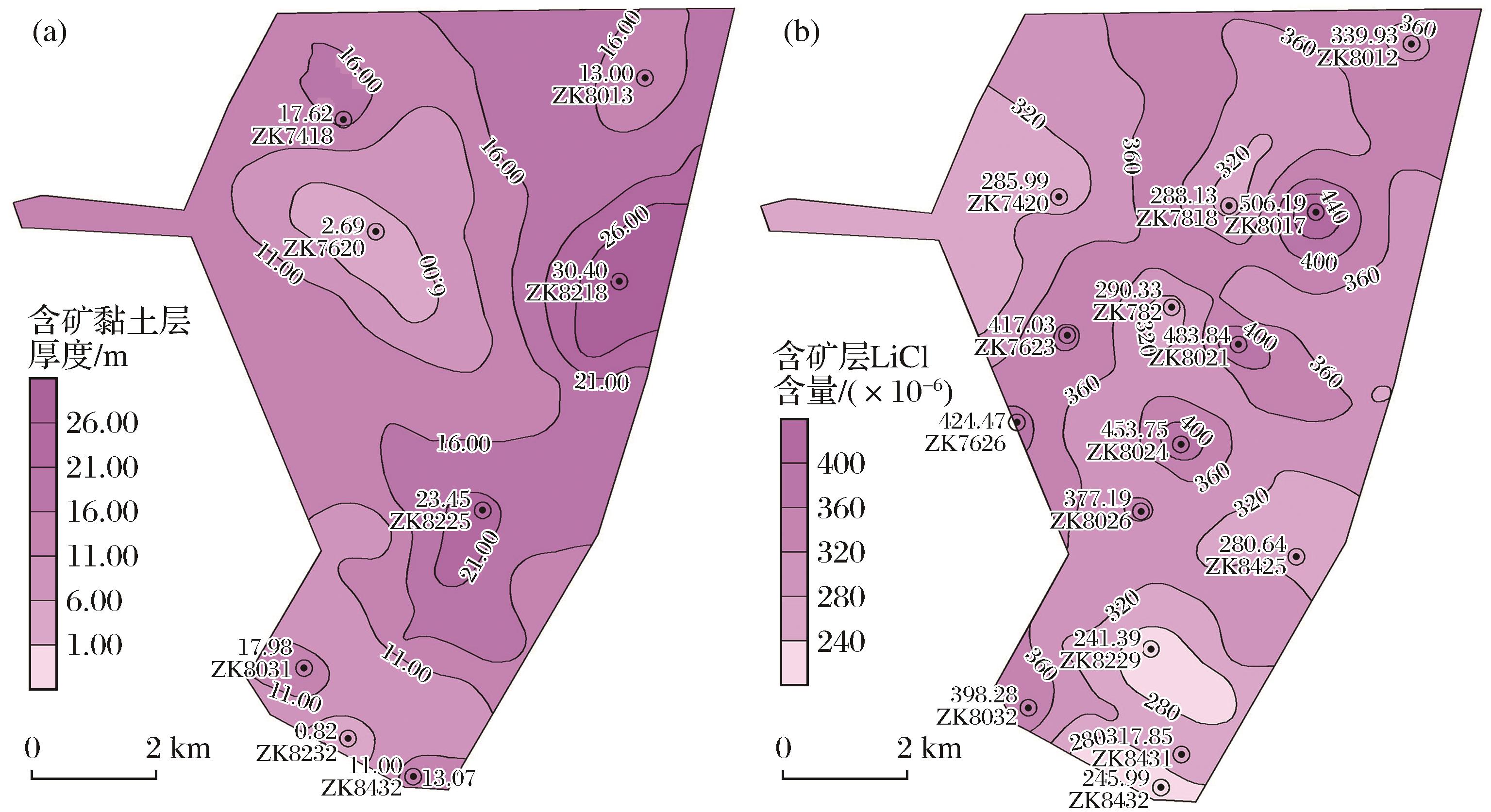 | 图6 NⅢ含矿黏土层特征参数等值线图 (a)NⅢ含矿黏土层分布及厚度等值线图;(b)NⅢ含矿黏土层LiCl含量等值线图 |