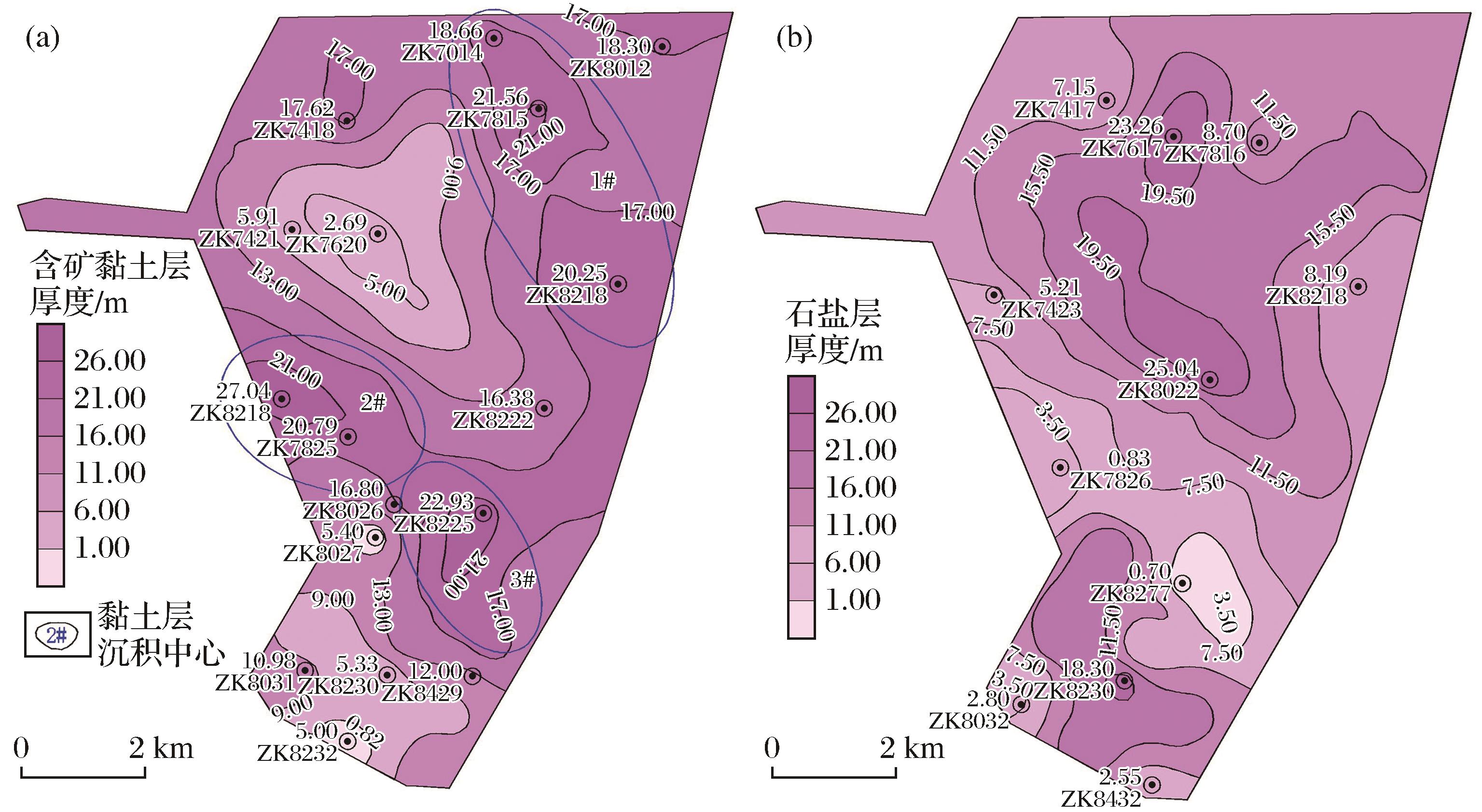 | 图7 含矿黏土层与石盐层厚度对比图 (a)含矿黏土层厚度等值线图;(b)石盐层厚度等值线图 |