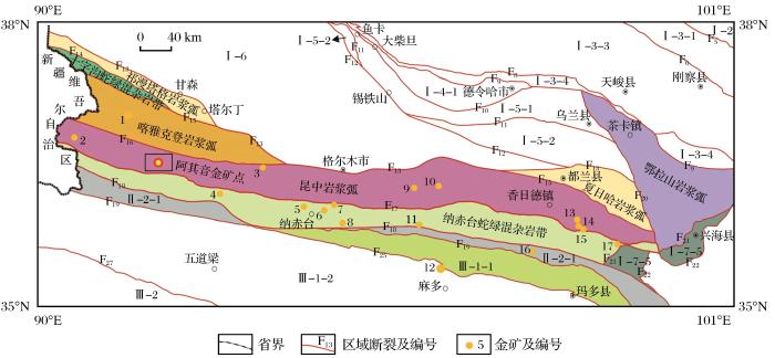 Ⅰ-2-北祁连造山带;Ⅰ-3-中南祁连造山带;Ⅰ-3-1-中祁连岩浆弧;Ⅰ-3-3-南祁连岩浆弧;Ⅰ-3-4-宗务隆山陆缘裂谷带;Ⅰ-4-全吉地块;Ⅰ-4-1-欧龙布鲁克被动陆缘;Ⅰ-5-柴北缘造山带;Ⅰ-5-1-滩间山岩浆弧;Ⅰ-5-2-柴北缘蛇绿混杂岩带;Ⅰ-6-柴达木地块;Ⅰ-7-东昆仑造山带;Ⅰ-7-5-苦海—赛什塘蛇绿混杂岩带;Ⅱ-1-昆南俯冲增生带;Ⅱ-2-阿尼玛卿—布青山俯冲增生带;Ⅱ-2-1-马尔争蛇绿混杂岩带;Ⅲ-1-巴颜喀拉地块;Ⅲ-1-1-玛多—玛沁前陆隆起;Ⅲ-1-2-可可西里前陆盆地;Ⅲ-2-三江造山带;F5-托莱河—南门峡断裂;F6-疏勒南山—拉脊北缘断裂;F8-宗务隆山—青海南山断裂;F9-宗务隆山南缘断裂;F10-全吉山南缘断裂;F11-赛什腾山—旺尕秀断裂;F12-柴北缘—夏日哈断裂(柴达木北缘断裂);F13-昆北断裂(北支);F14-小狼牙山断裂;F15-乌兰乌珠尔南缘断裂;F16-昆北断裂(南支);F17-昆中断裂;F18-昆南断裂;F19-布青山南缘断裂;F20-哇洪山—温泉断裂;F21-温泉—祁家断裂;F22-苦海—赛什塘断裂;F25-昆仑山口—甘德断裂;F27-可可西里南缘断裂;1-肯德可克金矿;2-库德尔特金矿;3-哈西亚图金矿;4-黑海北金矿;5-万保沟金矿;6-纳赤台金矿;7-小干沟金矿;8-驼路沟金矿;9-白日其利金矿;10-五龙沟金矿;11-开荒北金矿;12-大场金矿;13-阿斯哈金矿;14-按纳格金矿;15-果洛龙洼金矿;16-马尼特金矿;17-坑得弄舍金矿