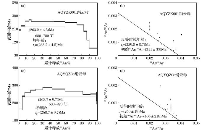 40Ar/39Ar age spectra (a,c) and 39Ar/40Ar vs.36Ar/40Ar inverse isochron (b,d) of sericite in the porphyritic quartz monzonite