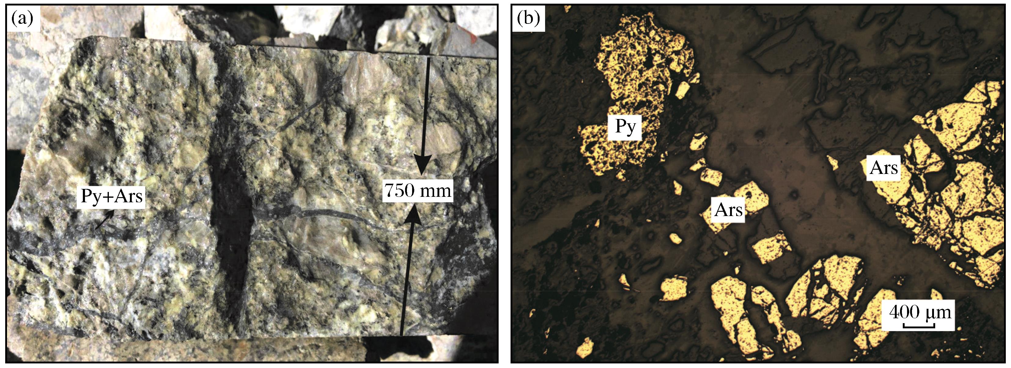 | 图3 脉状黄铁矿化和毒砂矿化岩芯照片(a)和显微镜下正交偏光照片(25×)(b) Py-黄铁矿;Ars-毒砂 |