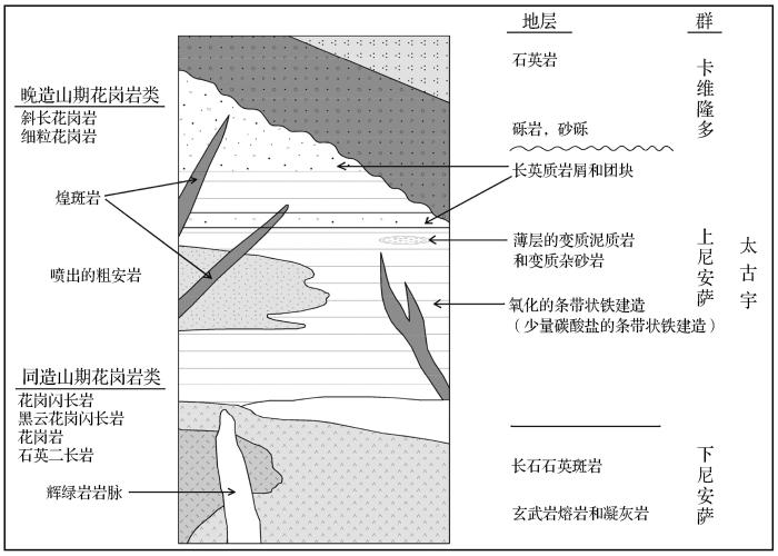 盖塔绿岩带出露地层主要有太古宇下尼安萨群、上尼安萨群和卡维隆多群,其岩性简述如下: