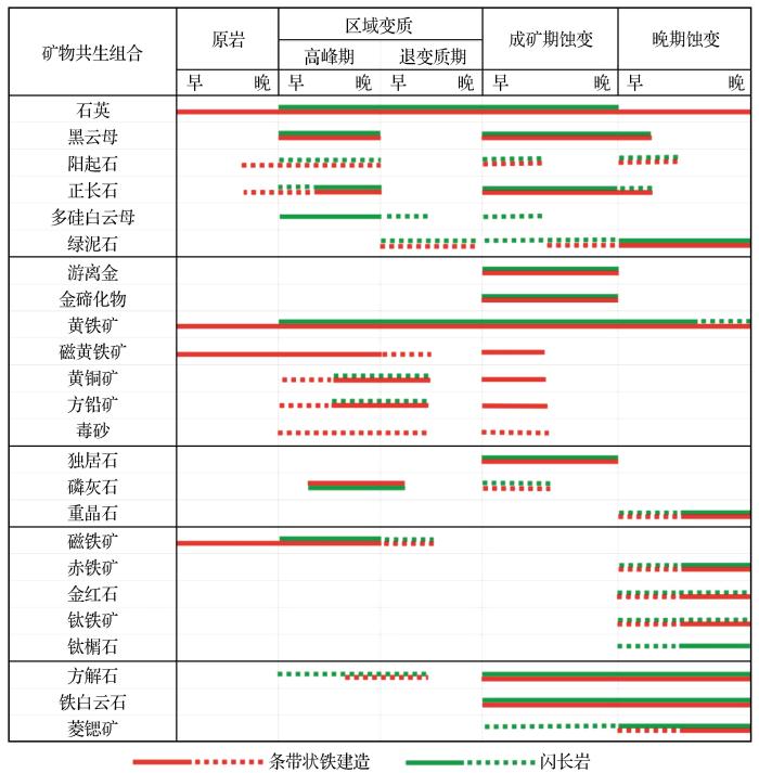 金矿床内原生矿石的共生组合以游离金—石英—黄铁矿—磁黄铁矿—方解石—铁白云岩为主,毒砂较为少见,氧化矿石以游离金—石英—绿泥石—赤铁矿为主。