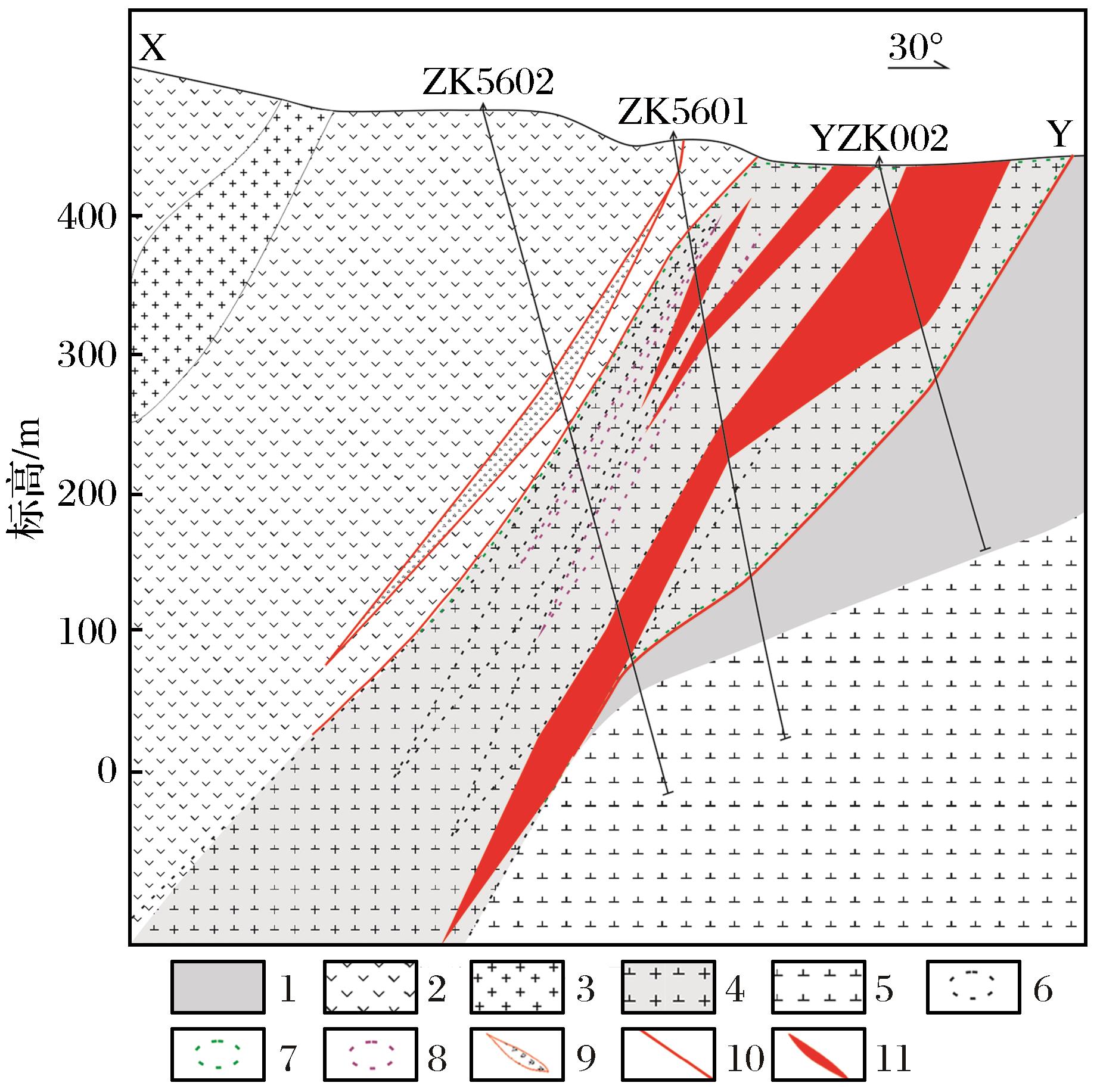 | 图4 玉带铜矿床56号勘探线剖面图及蚀变分带 1.凝灰质砂岩;2.安山岩;3.霏细岩;4.石英闪长玢岩;5.闪长玢岩;6.钾化—硅化—绢云母化带;7.绿泥石—绿帘石—绢云母化带;8.硅化—黄铁矿化—绢云母化带;9.构造角砾岩;10.断层;11.铜矿体 |