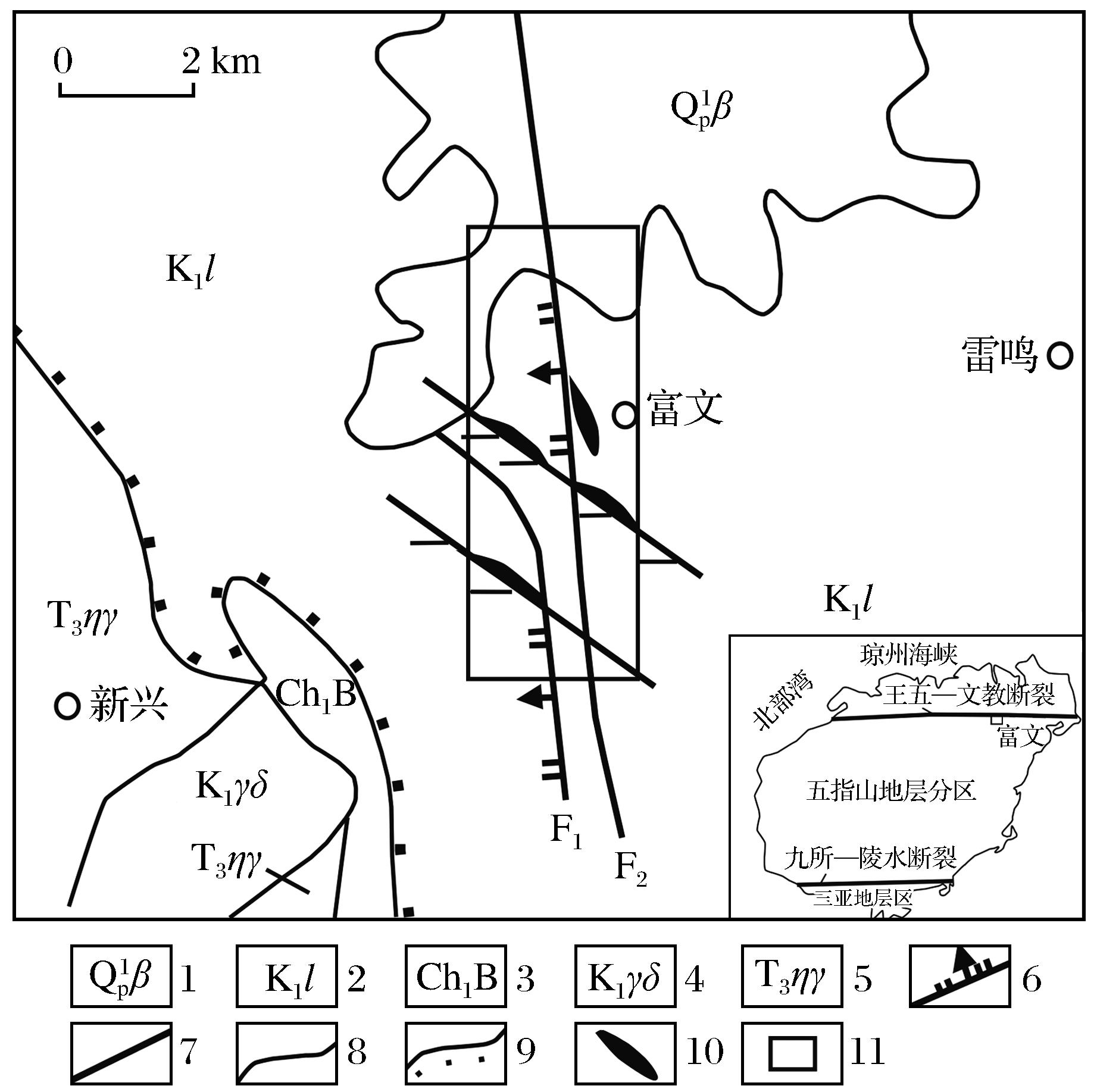 | 图1 富文地区地质简图(修改自 1.第四系;2.白垩系;3.长城系;4.白垩纪花岗闪长岩;5.三叠纪二长花岗岩;6.正断层;7.断层;8.地层界限;9.地层不整合接触;10.金矿脉;11.矿区范围 |