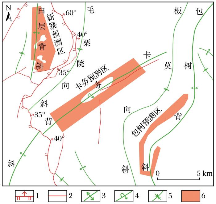 成矿构造:白层背斜、断裂;成矿结构面:T1-2l/P3w构造蚀变体(SBT)、断裂;赋矿地层:T1-2l、T2x和T2b;容矿岩石:构造角砾岩、钙质砂岩、钙质粉砂岩和黏土质粉砂岩;矿体类型:层控、断控;热液蚀变:硅化、黄铁矿化、褐铁矿化、方解石化、白云石化和黏土化;已有矿床(点):新寨;矿体埋深:100~500 m