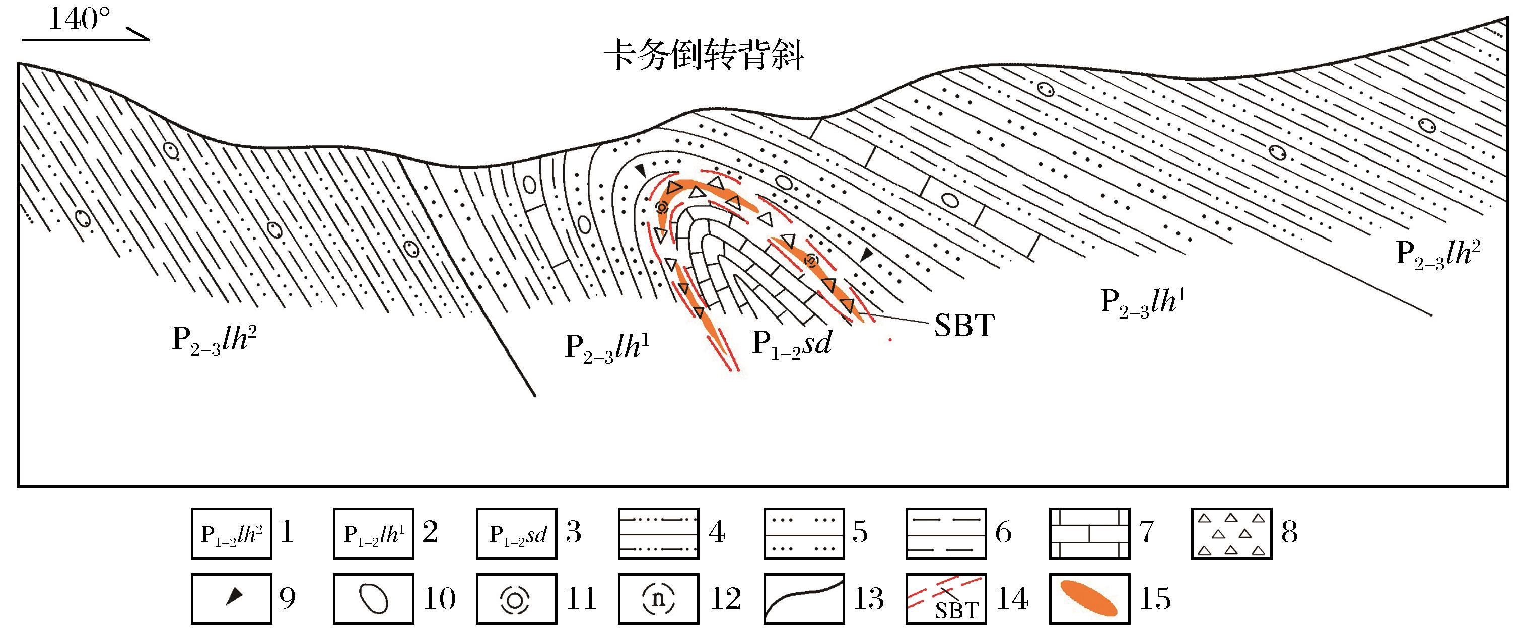 | 图2 卡务金矿构造蚀变体剖面示意图 1.中—上二叠统领薅组二段;2.中—上二叠统领薅组一段;3.中—下二叠统四大寨组;4.黏土质粉砂岩;5.砂岩;6.黏土岩;7.灰岩;8.角砾岩;9.岩屑;10.砾屑;11.硅化;12.黄铁矿化;13.地层界线;14.构造蚀变体及界线;15.金矿体 |