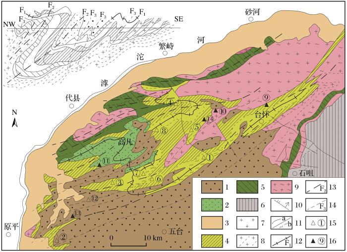 1.滹沱群;2.五台群上亚群变沉积岩;3.五台群下亚群火山—沉积岩系;4.五台群下亚群上部含铁岩系;5.五台群下亚群下部含铁岩系;6.阜平岩群;7.吕梁期花岗岩;8.五台晚期花岗岩;9.五台早期花岗—片麻岩(TTG杂岩);10.晚期断层;11.剪切变形带:a.剖面图中,b.地质图中;12.F1褶皱轴迹;13.F2褶皱轴迹;14.F3褶皱(吕梁期)轴迹;15.金矿床及编号;16.金矿点及编号矿床(点)名称:①-东腰庄金矿;②-狐狸山金矿;③-殿头金矿;④-小板峪金矿;⑤-康家沟金矿;⑥-代银掌金矿;⑦-上扬花金矿;⑧-小中咀金矿;⑨-柏枝岩金矿点;⑩-大西沟金矿点;⑪-张仙堡金矿点;⑫-七图金矿;⑬-西山底金矿点;⑭-刘家坪金矿点