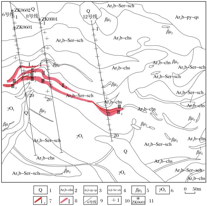 研究区位于台怀—李家寨同斜倒转复式向斜的西端、李家寨—大草坪韧性剪切带南部发生转弯的部位(刘志宏等,1997)。由于受构造影响,区内岩层强烈变形、片理发育,岩层展布基本与区域主构造线方向一致,岀露岩层主要为新太古界五台群柏枝岩组绿泥片岩和绢云片岩,黄铁矿化、硅化、电气石化、绢云母化和碳酸盐化等蚀变现象明显。岩浆岩主要为五台期斜长花岗岩和吕梁期变质辉绿岩(脉),五台期斜长花岗岩分布于研究区西南部,呈岩墙状产出,岩体具弱片麻理。吕梁期变质辉绿岩主要分布于研究区的北部和中部,呈岩脉或岩床状产出,受区域构造影响,变辉绿岩脉边部具强烈片理化现象。通过地表槽探工程揭露和深部钻探工程验证,初步圈定出3条金矿(化)带和9条金矿体(图2)。