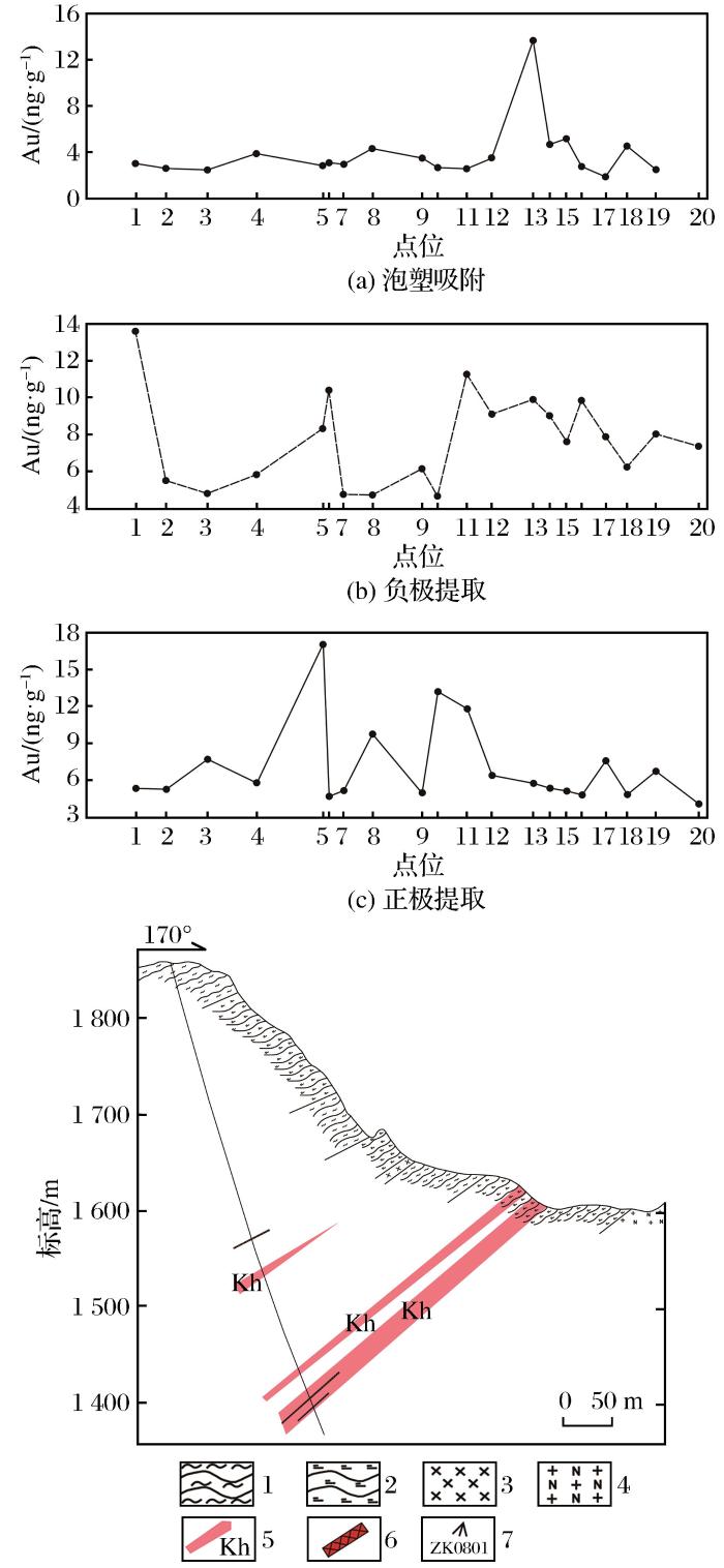 不通电情况下的泡塑吸附提取在该剖面的主矿(化)体延伸到浅地表时,对应采样点才有明显的Au异常峰显示,在矿(化)体埋深较大的区域内依然未能提取到明显的Au异常,这与6号勘探线剖面的勘探效果一致。