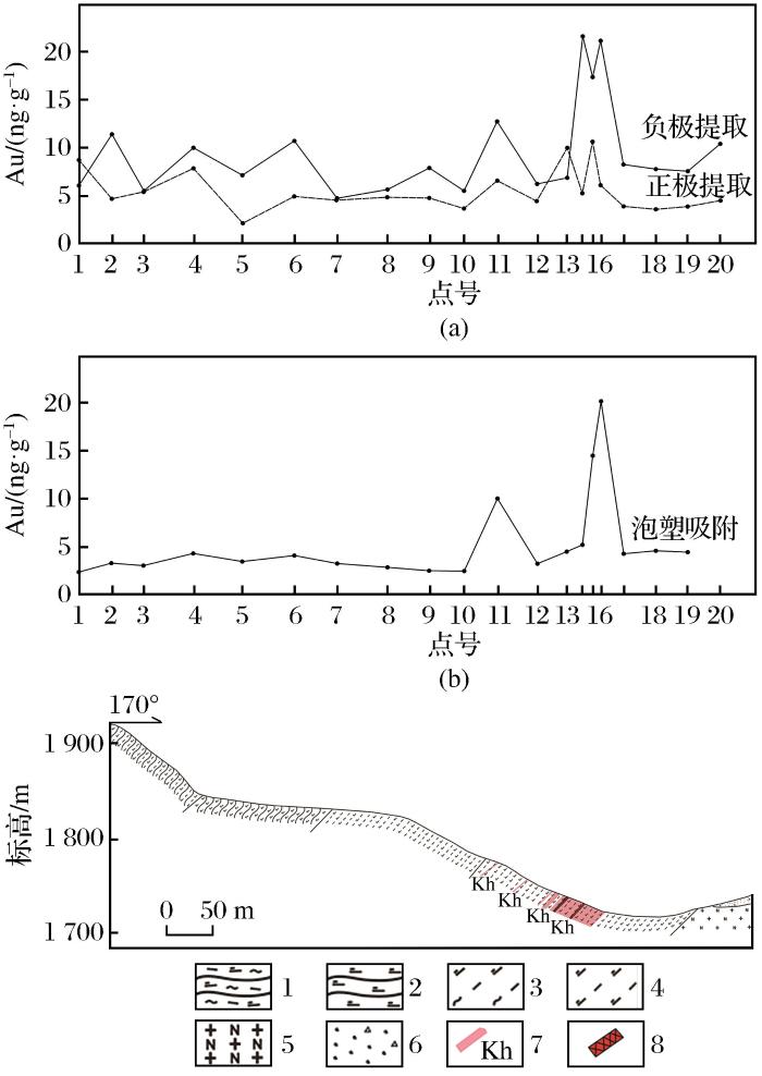与之相比,不通电情况下的泡塑吸附提取在该剖面的主矿(化)体Kh1延伸到浅地表的13~17号测点时,才有明显的Au异常显示,最高值为9.77 ng/g,但是在主矿(化)体埋深较大的区域内未能提取到明显的Au异常,且对近地表附近的Kh2矿化体也没有Au异常反映。