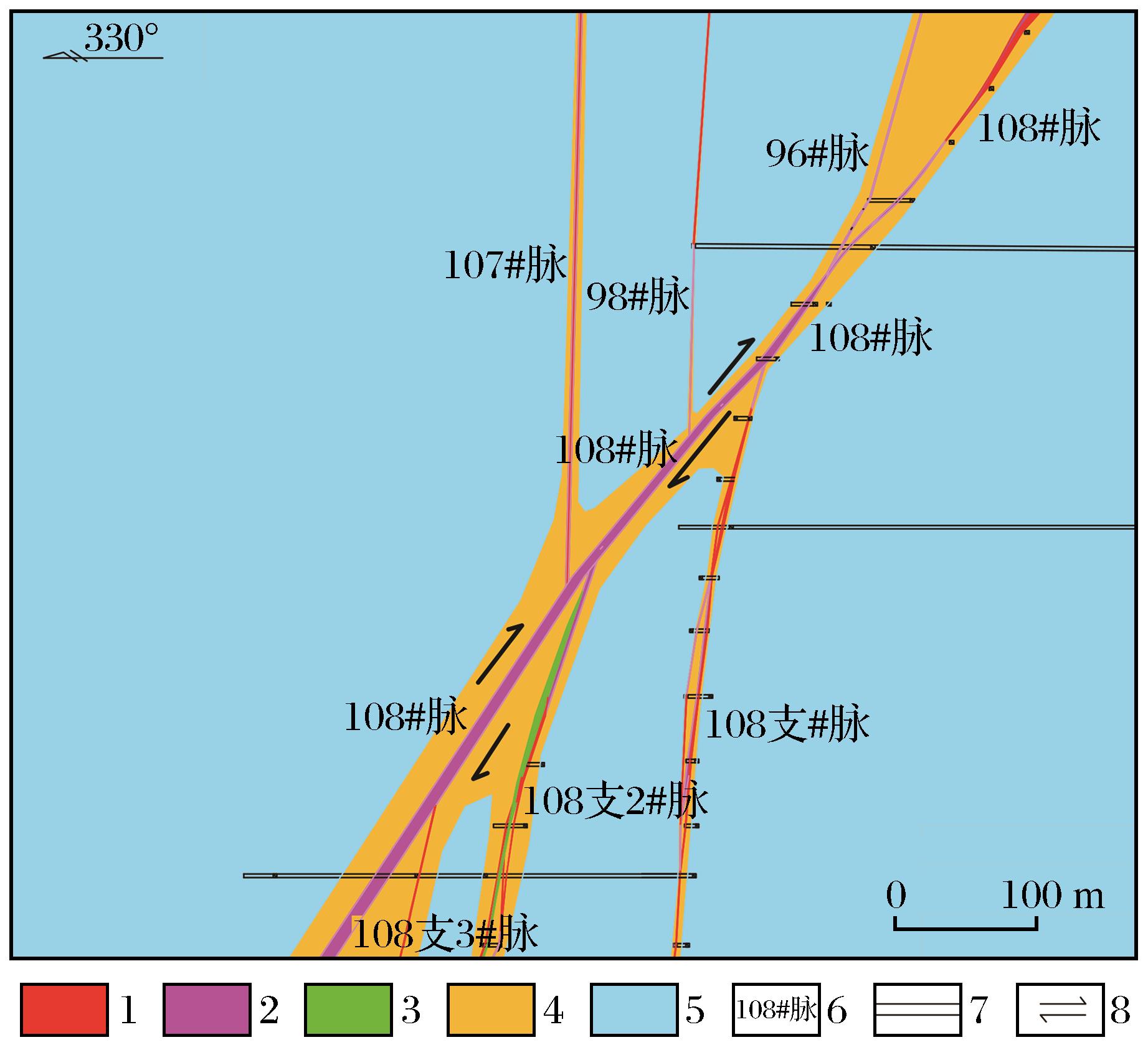 | 图9 玲珑金矿田108#脉支脉控矿模式剖面图 1.黄铁石英脉;2.绢英岩;3.煌斑岩;4.钾化花岗岩;5.玲珑花岗岩;6.矿脉编号;7.坑探巷道;8.断裂移动方向 |