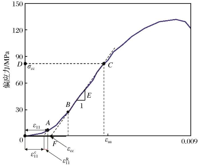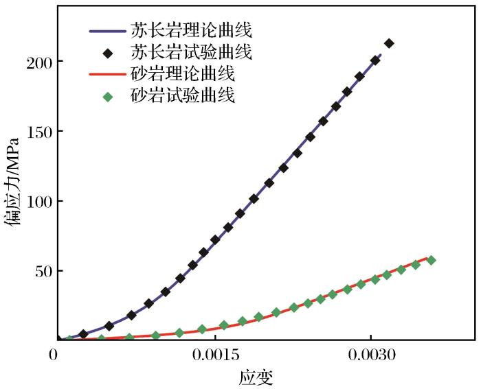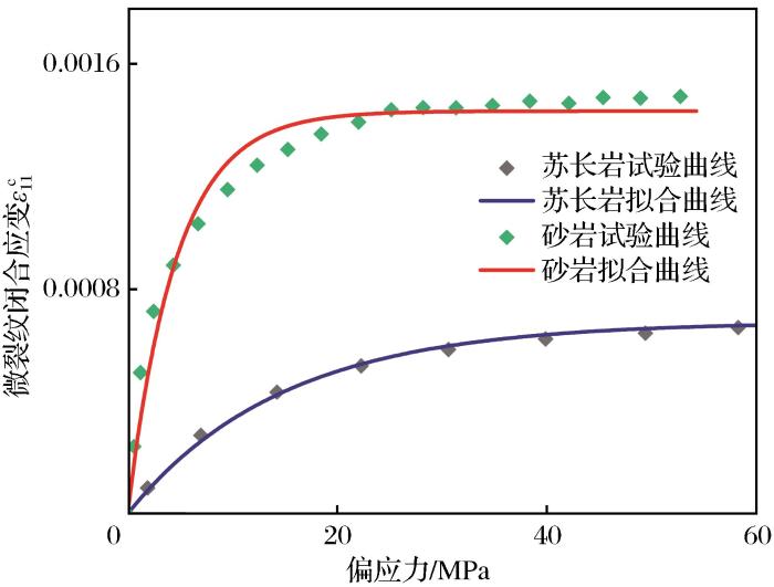 当i=j=1时,ε就变为ε,表示微缺陷部分所引起的轴向应变,所以ε与偏应力存在函数关系。由于岩石骨架部分在微裂纹萌生前只发生弹性变形,所以岩石骨架部分的应变与应力呈线性关系。研究表明,当轴向应力较小时,微缺陷部分产生的轴向应变ε是随轴向应力的增大而增加的;微缺陷完全闭合时,ε不再随轴向应力的增大而增加,而是趋于一个稳定值。微缺陷产生的轴向应变与轴向应力呈负指数关系(Peng et al.,2015):