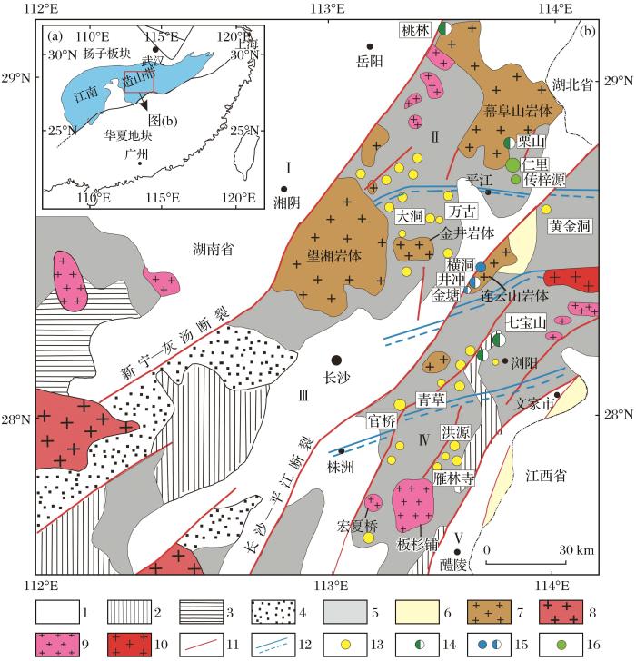 Ⅰ-汨罗断陷盆地;Ⅲ-幕阜山—望湘断隆;Ⅲ-长沙—平江断陷盆地;Ⅳ-浏阳—衡东断隆;Ⅴ-醴陵—攸县断陷盆地;1.第四系—白垩系;2.三叠—泥盆系;3.志留—震旦系;4.新元古界板溪群;5.新元古界冷家溪群;6.古元古界—太古宇;7.燕山期花岗岩;8.印支期花岗岩;9.加里东期花岗岩;10.元古宙花岗岩;11.断裂;12.韧性剪切带;13.金矿床(点);14.铅锌铜多金属矿床(点);15.钴矿床(点)/钴多金属矿床(点);16.稀有金属矿床