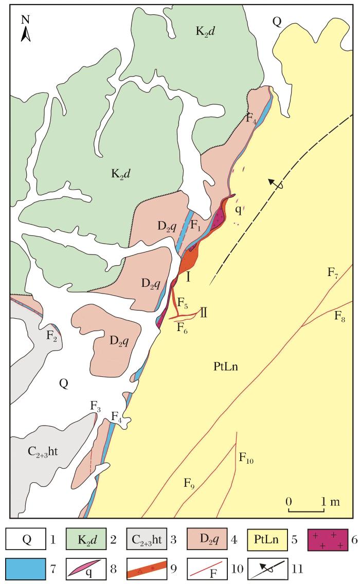 1.第四系;2.上白垩统戴家坪组;3.中—上石炭统壶天群;4.中泥盆统棋梓桥组;5.新元古界冷家溪群;6.连云山花岗岩;7.构造挤压破碎岩带;8.石英脉;9.矿化蚀变带;10.断层;11.倾伏背斜
